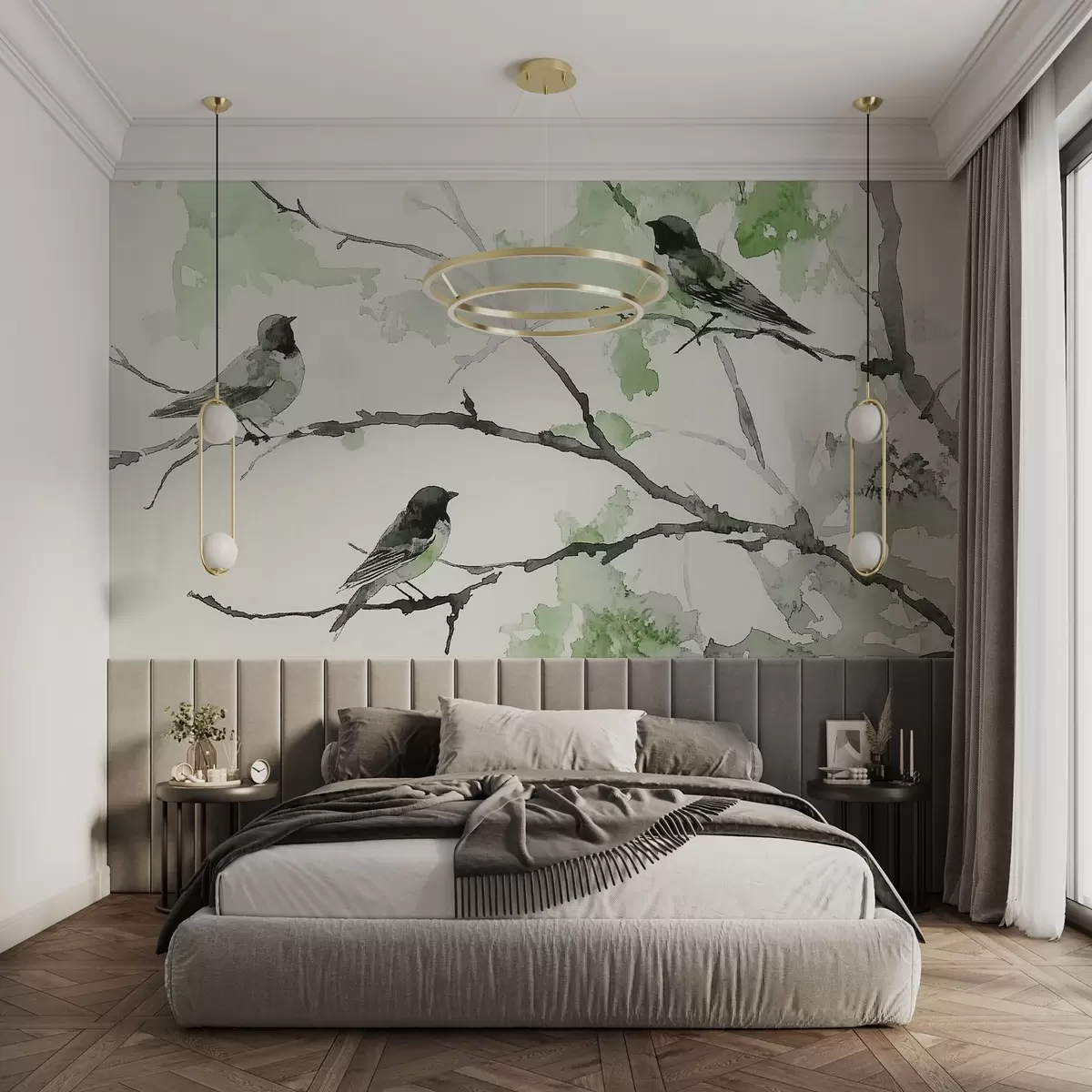 Carta da parati Uccelli sui rami degli alberi in stile acquerello nr. w09064v3