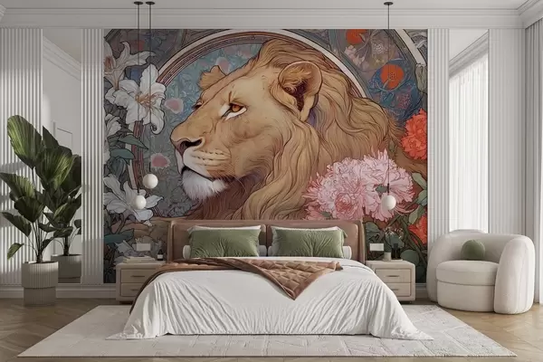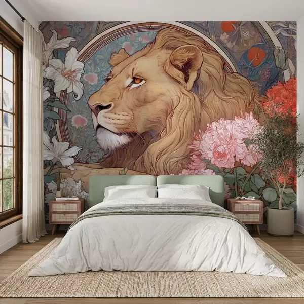 Carta da parati Un leone circondato da molti fiori nello stile di Alphonse Mucha nr. w09073