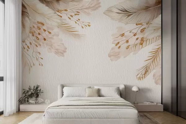 Carta da parati Erba della pampa e piume in stile acquerello in beige e bianco su carta nr. w09079