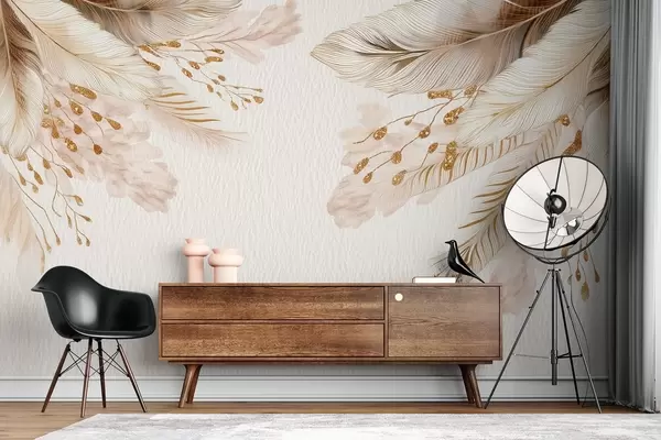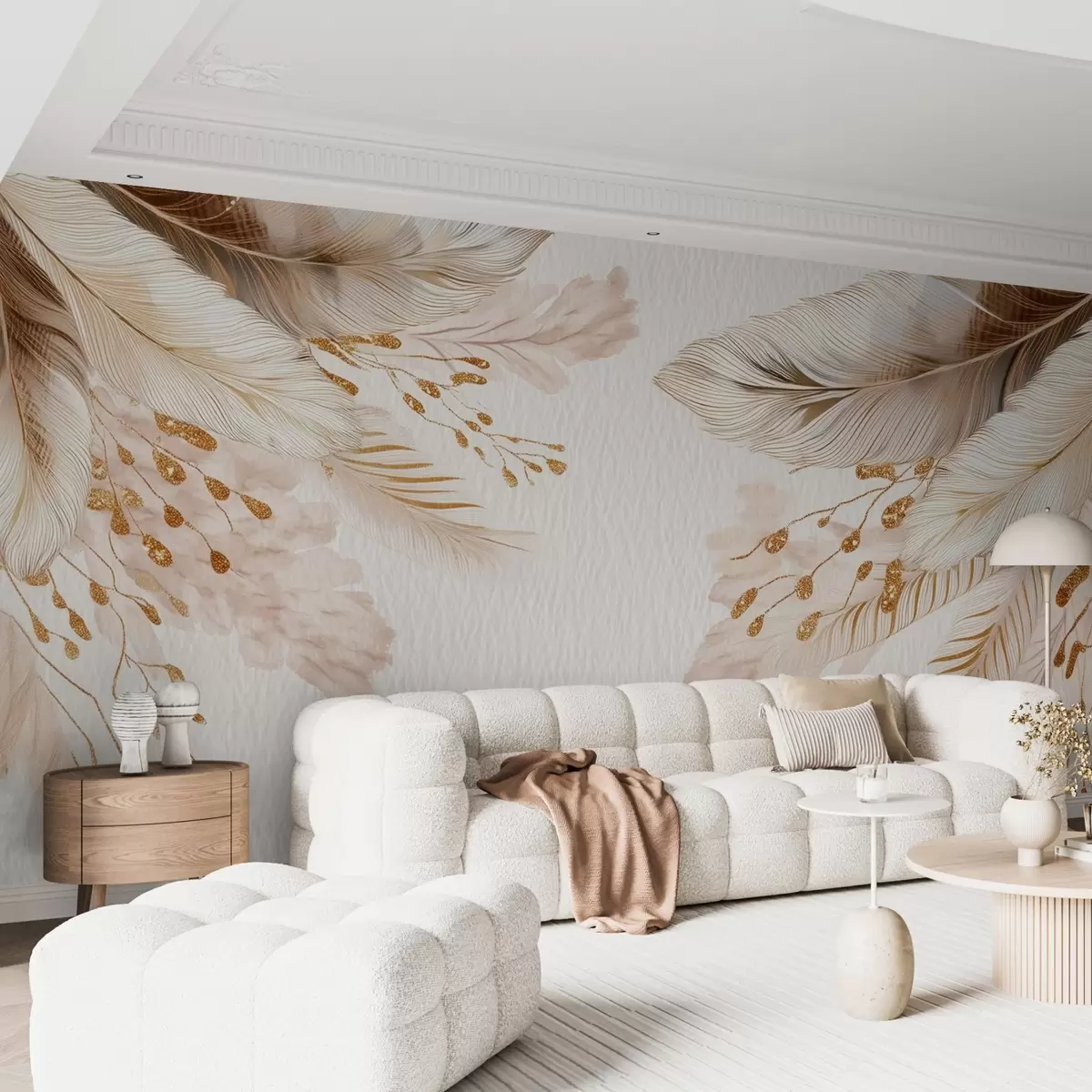 Carta da parati Erba della pampa e piume in stile acquerello in beige e bianco su carta nr. w09079
