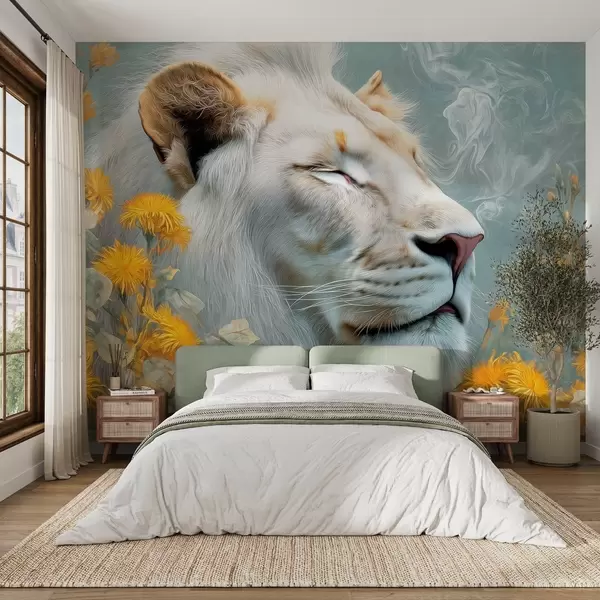 Carta da parati Un leone bianco circondato da fiori gialli e fumo nr. w09080