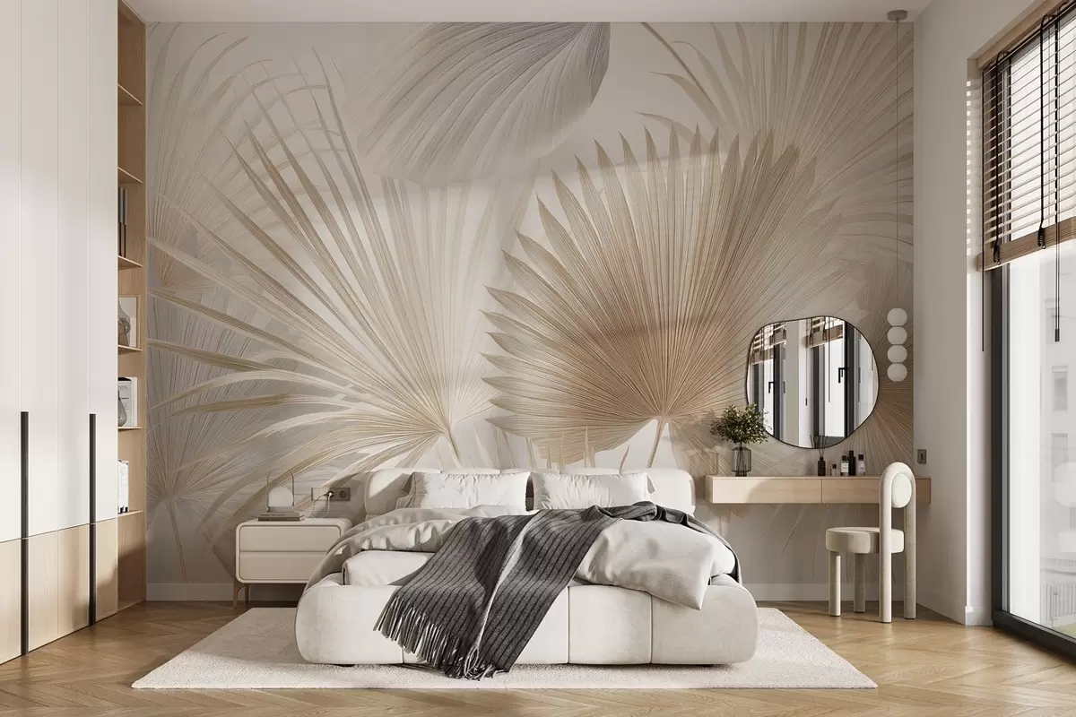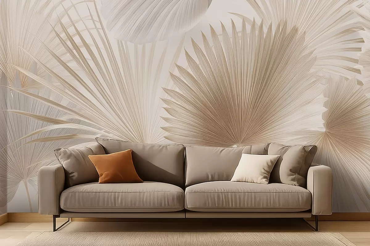 Carta da parati Morbidi ventagli di foglie tropicali nei toni del beige chiaro e dell'azzurro nr. w09084