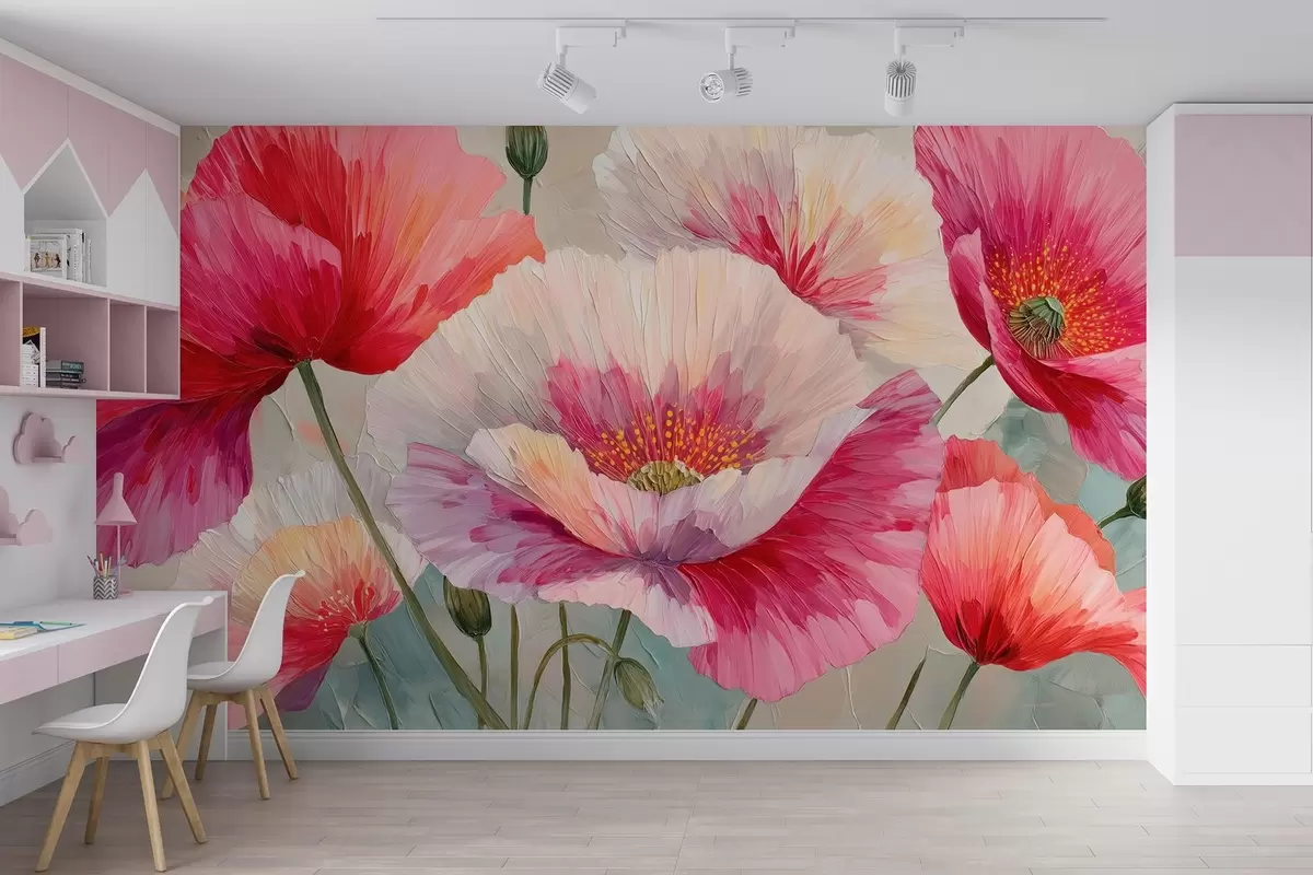 Carta da parati Papaveri bianchi e rossi in stile pittura ad olio con pennellate audaci nr. w09097