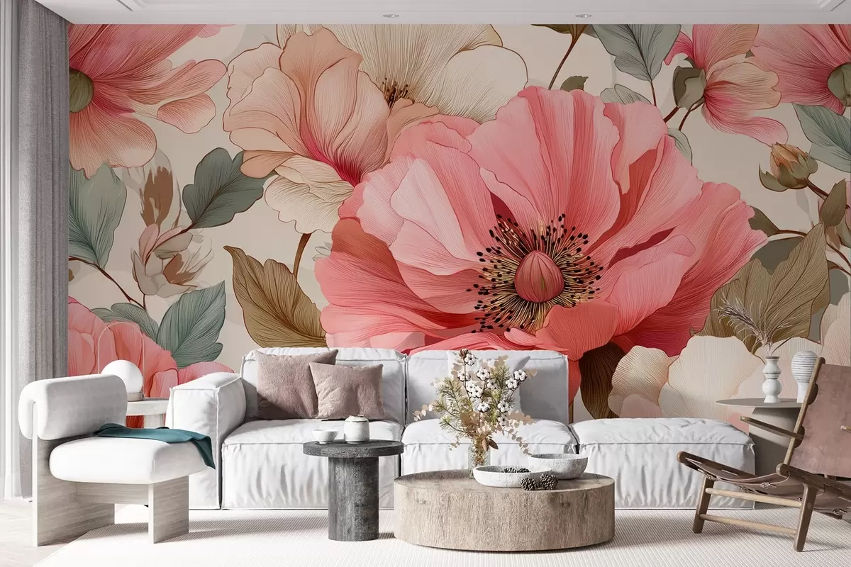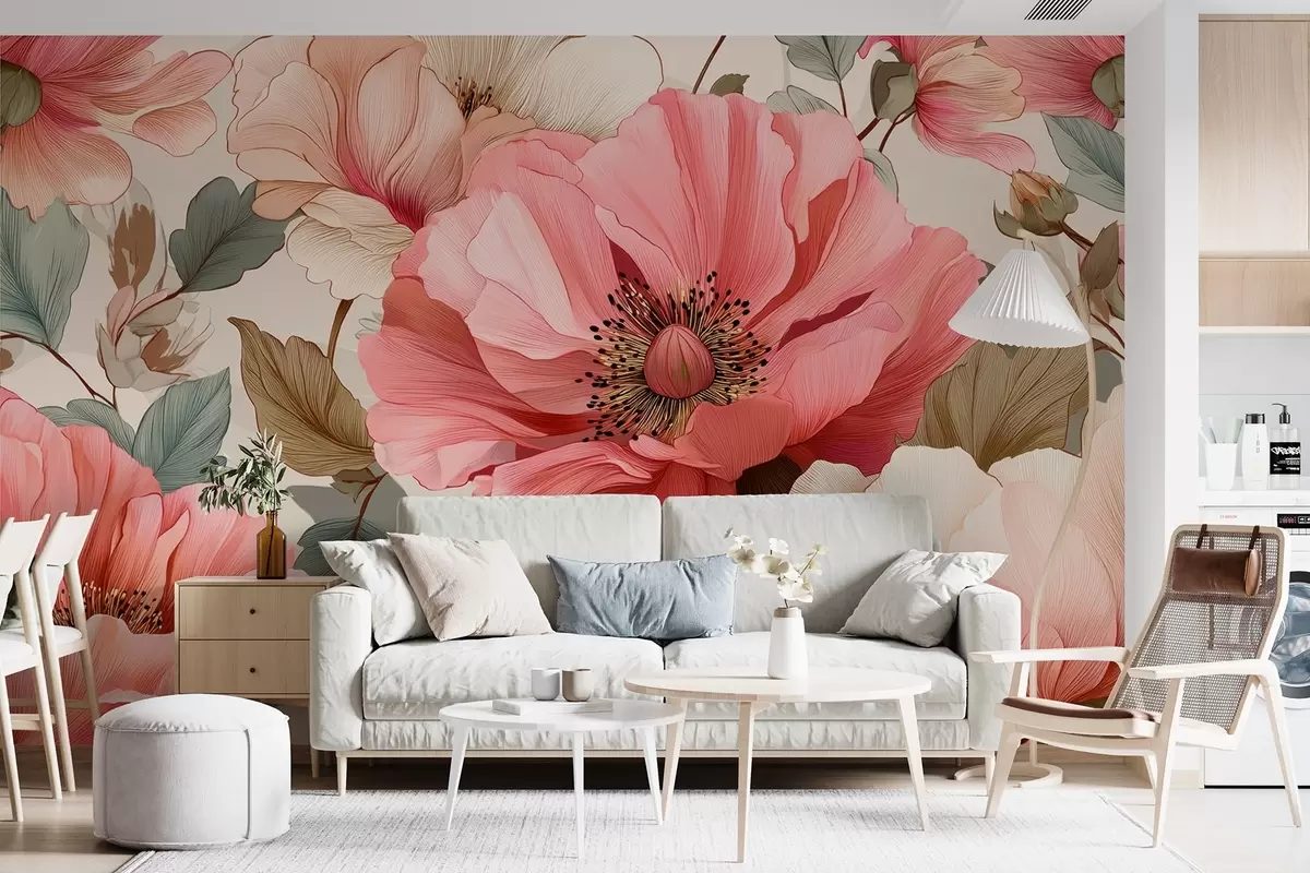 Carta da parati Delicati papaveri con foglie dai toni rosso-rosa nr. w09100