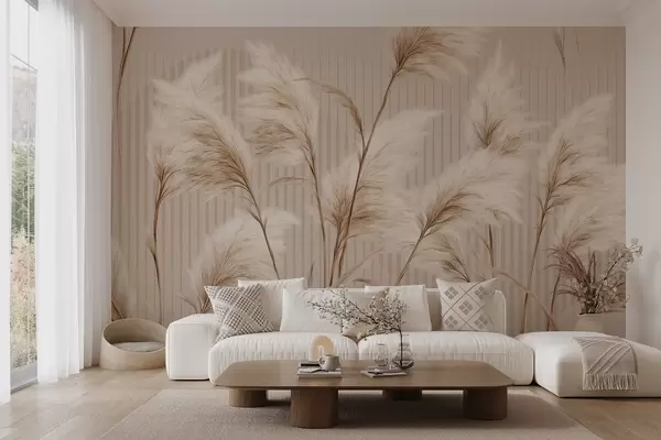 Carta da parati Erba della pampa su uno sfondo di linee nei toni del beige nr. w09104