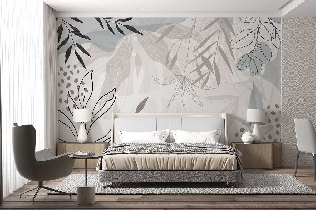 Carta da parati Design astratto floreale moderno con foglie beige pastello, grigie, blu e nere, line art delicate e sfondo morbido nr. w09105