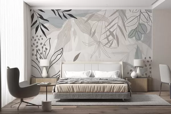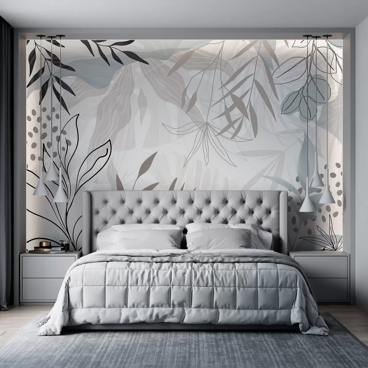 Carta da parati Design astratto floreale moderno con foglie beige pastello, grigie, blu e nere, line art delicate e sfondo morbido nr. w09105