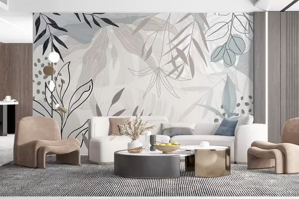 Carta da parati Design astratto floreale moderno con foglie beige pastello, grigie, blu e nere, line art delicate e sfondo morbido nr. w09105