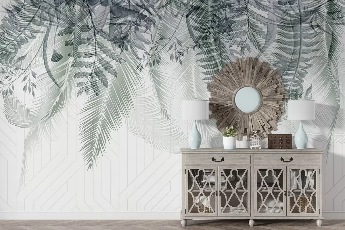 Carta da parati Delicata caduta di foglie di felce e palma tropicale, sfondo geometrico, luce soffusa, colori tenui, elegante nr. w09106