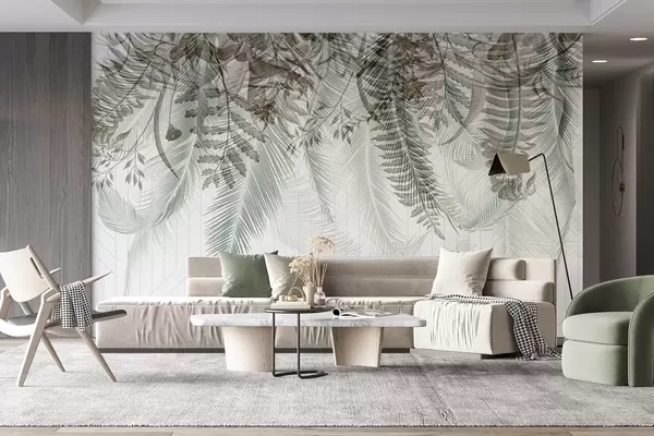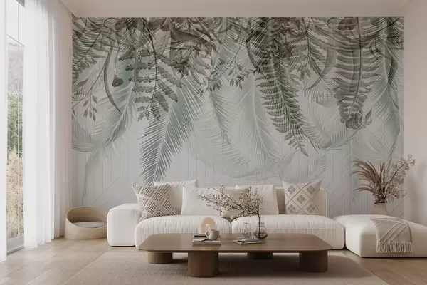 Carta da parati Delicata caduta di foglie di felce e palma tropicale, sfondo geometrico, luce soffusa, colori tenui, elegante nr. w09106v1