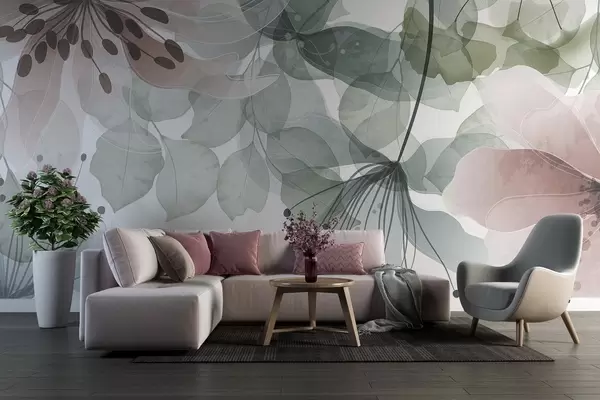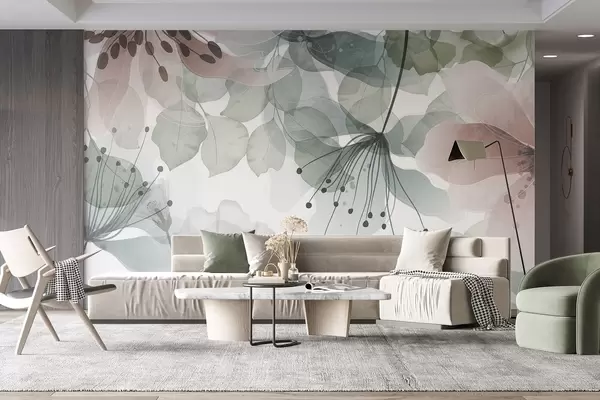 Carta da parati Fiori e foglie in colori pastello, petali e foglie traslucidi, effetto acquerello morbido, linee delicate, sfondo bianco nr. w09107