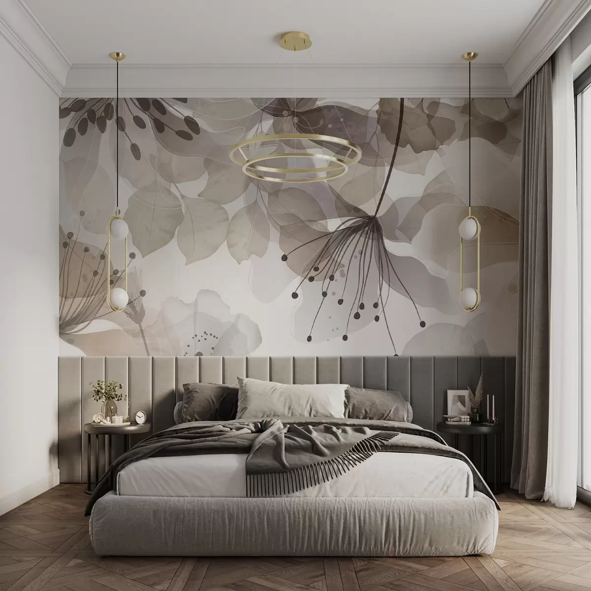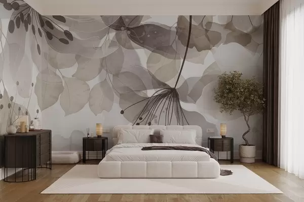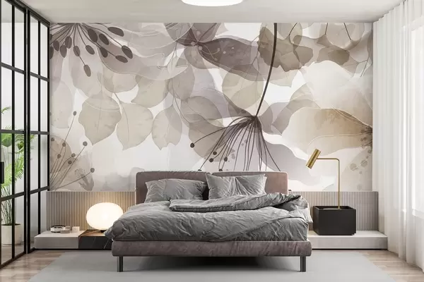 Carta da parati Fiori e foglie nei colori beige, petali e foglie traslucidi, effetto acquerello morbido, linee delicate, sfondo bianco nr. w09107v1