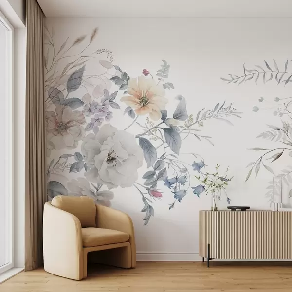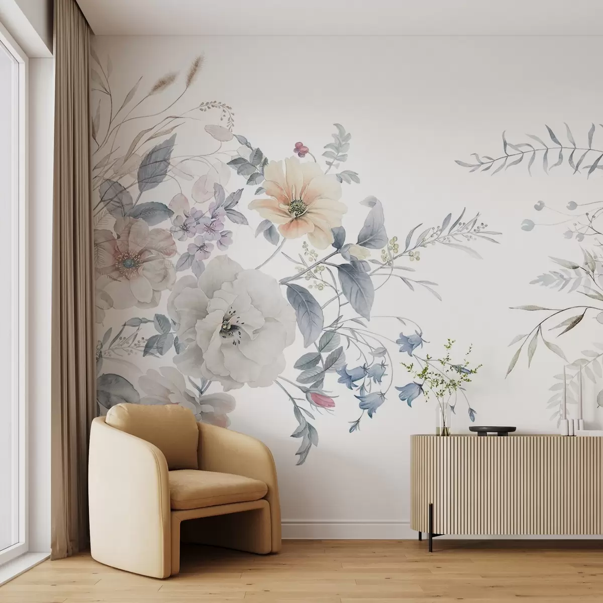 Carta da parati Composizione floreale in stile pittura ad acquerello con fiori bianchi, pesca e blu, verde delicato su sfondo bianco nr. w09108