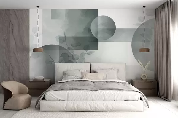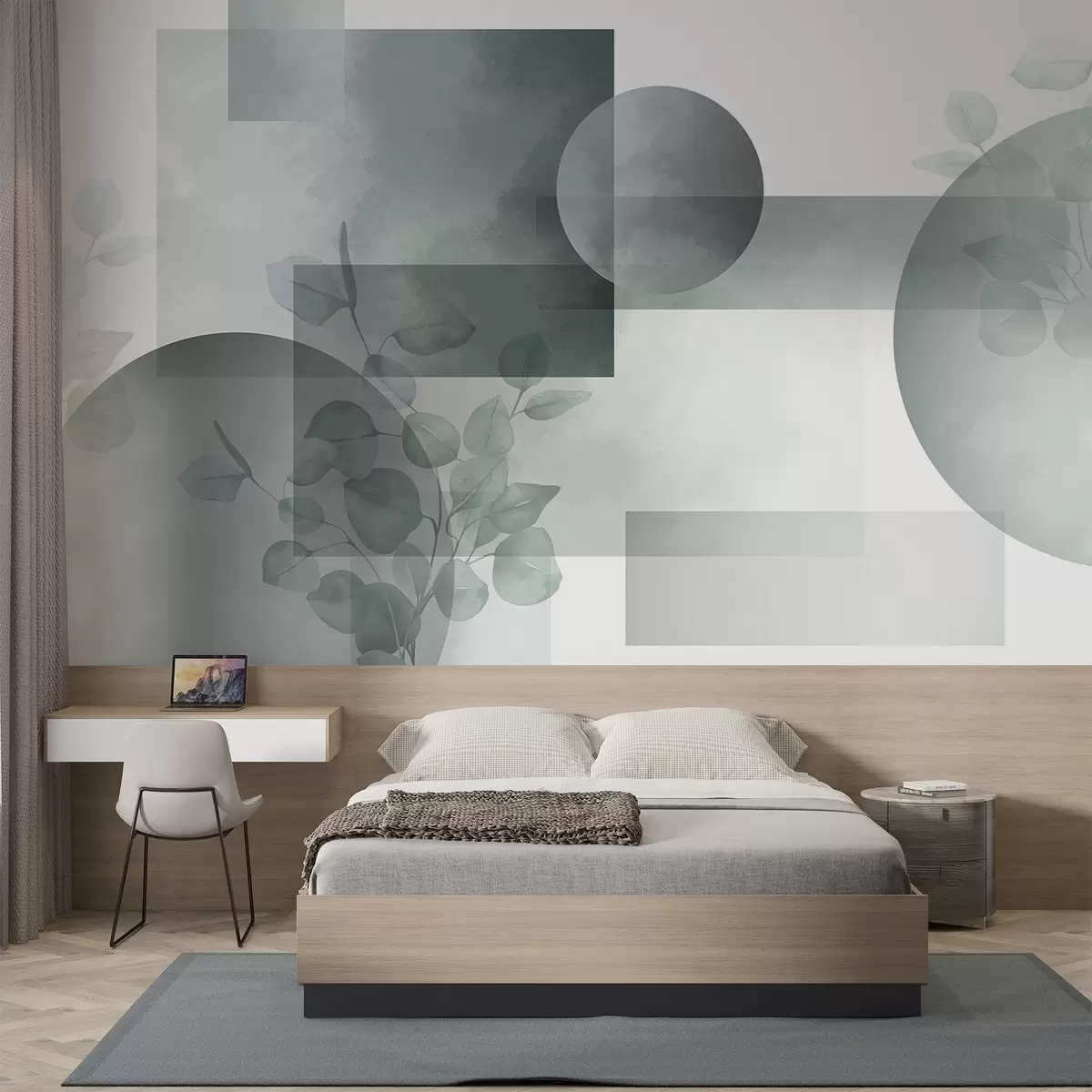 Carta da parati Disegno geometrico astratto moderno e minimalista con cerchi e rettangoli, foglie di eucalipto, effetto acquerello nr. w09110
