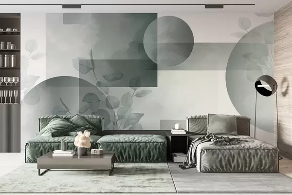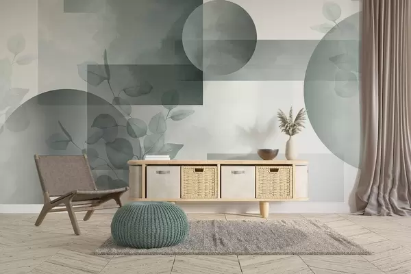 Carta da parati Disegno geometrico astratto moderno e minimalista con cerchi e rettangoli, foglie di eucalipto, effetto acquerello nr. w09110