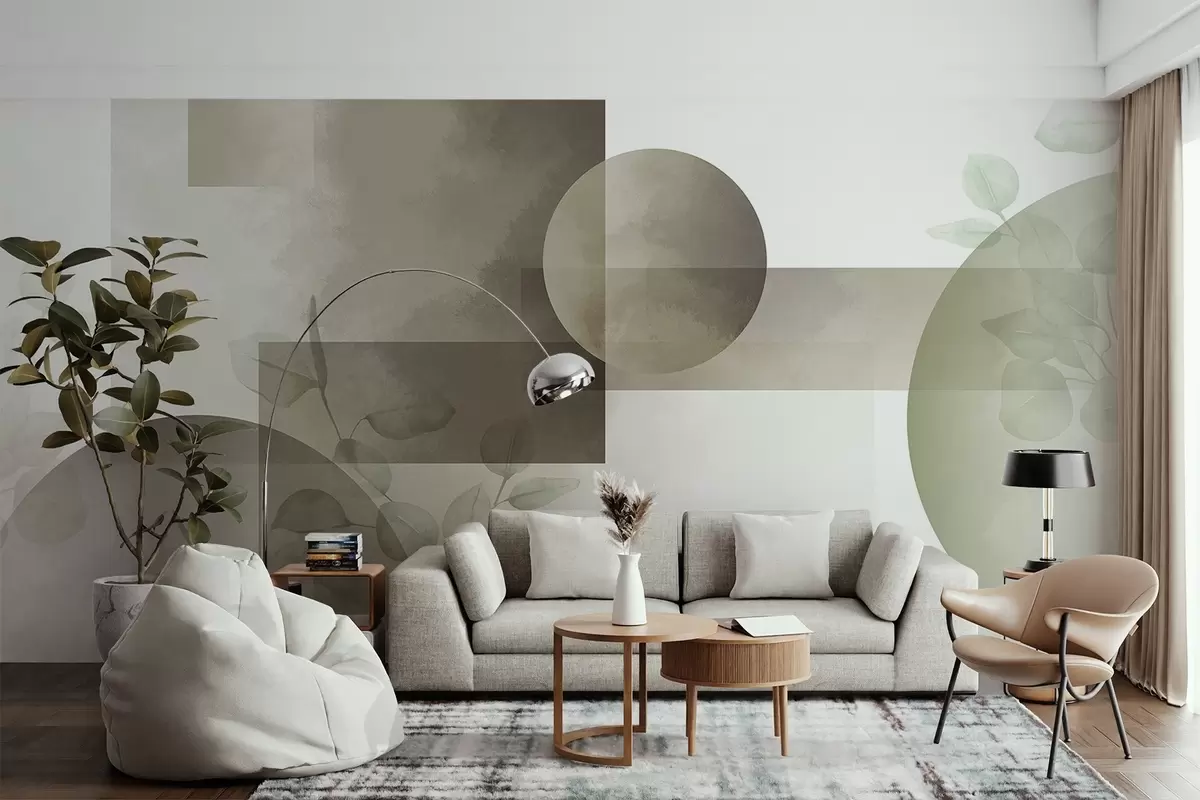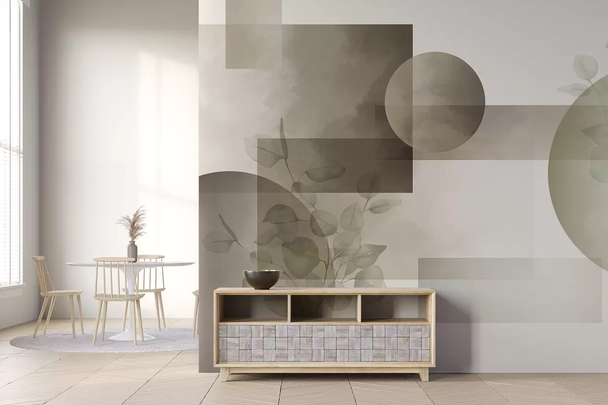 Carta da parati Disegno geometrico astratto moderno e minimalista con cerchi e rettangoli, foglie di eucalipto, effetto acquerello nr. w09110v1
