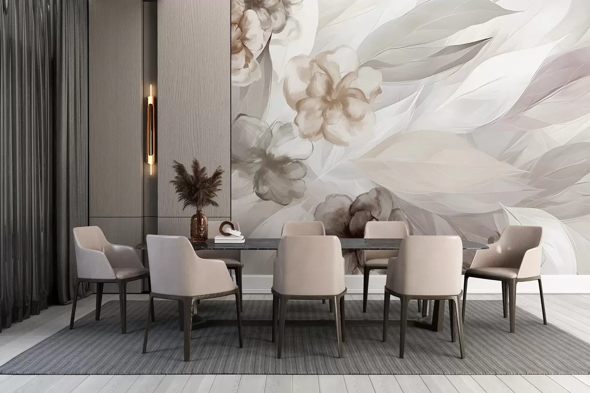 Carta da parati Delicati fiori e foglie nei toni del bianco, marrone e beige sfondo floreale, colori tenui, petali delicati nr. w09111v1