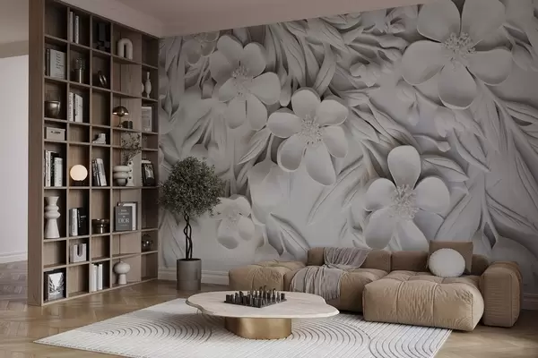 Carta da parati Fiori e foglie bianchi su sfondo bianco, design floreale elegante e decorativo, dettagli intricati nr. w09113