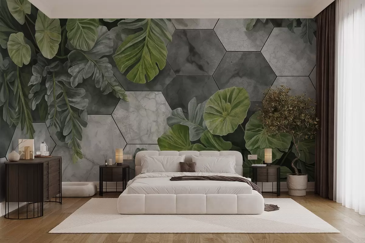 Carta da parati Foglie e piante tropicali verdi su uno sfondo di piastrelle grigie e bianche, design moderno con fogliame lussureggiante nr. w09117