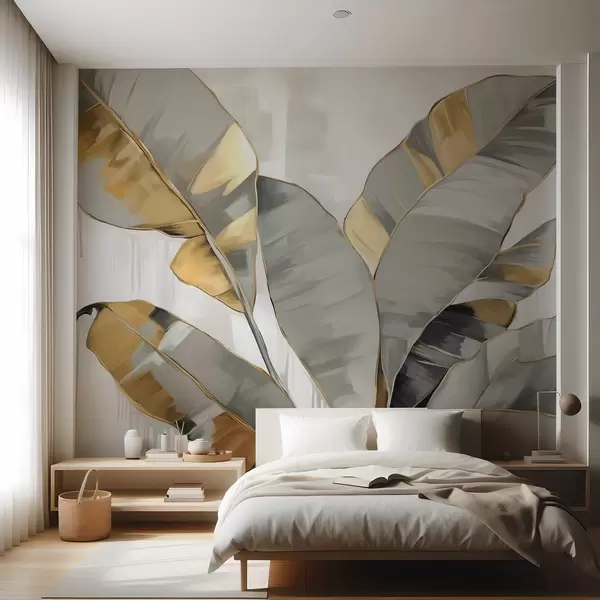 Carta da parati Foglie di banano tropicale con toni grigi e gialli, stile moderno, sfondo neutro, pittura decorativa nr. w09118