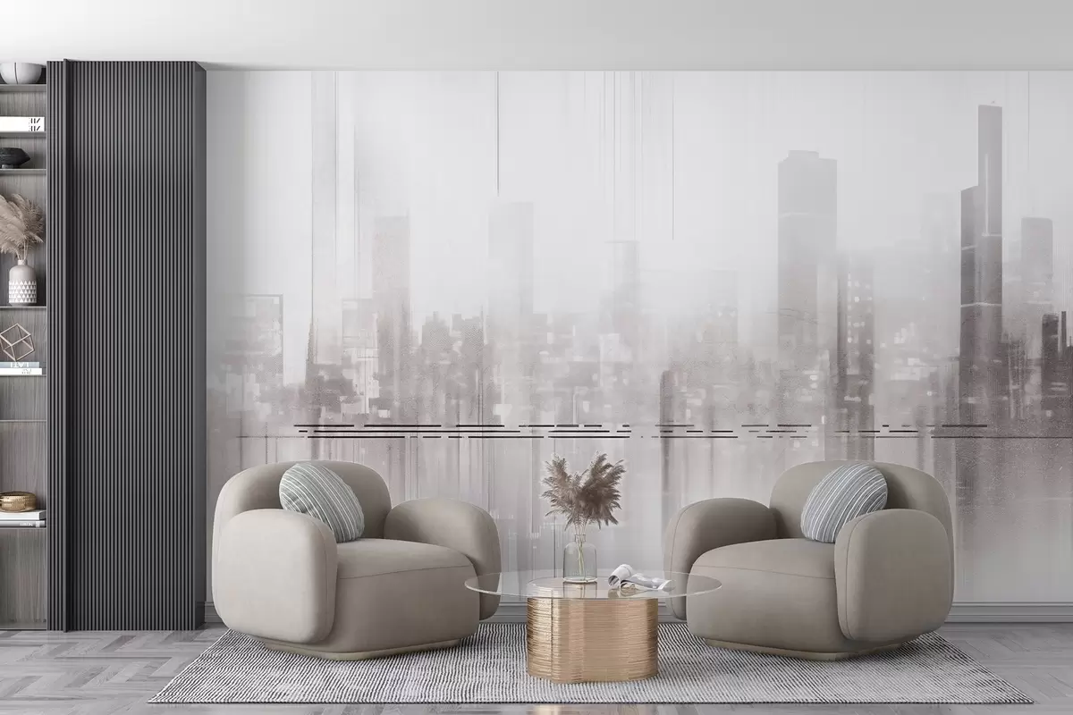 carta da parati Paesaggio urbano astratto con edifici alti e strisce, nei toni del grigio e del bianco, che creano un effetto nebuloso nr. w09119