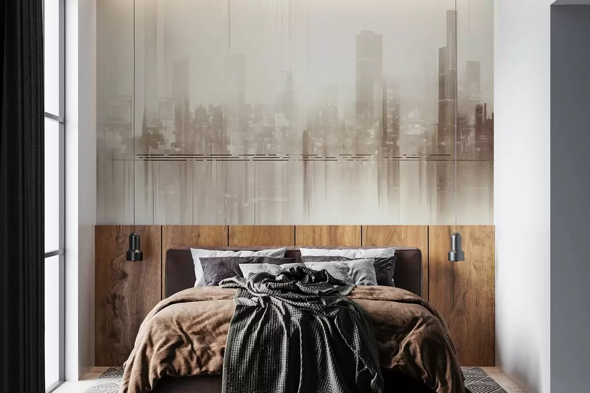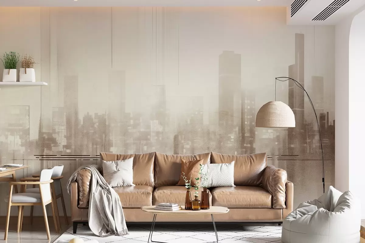 Carta da parati Paesaggio urbano astratto con edifici alti e strisce, nei toni del beige e del bianco, che creano un effetto nebuloso nr. w09119v1