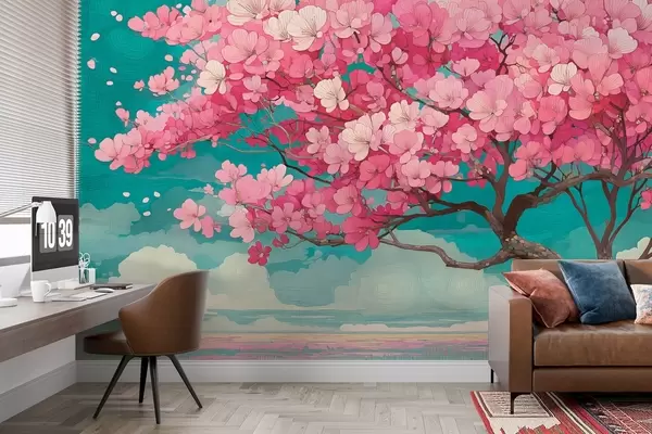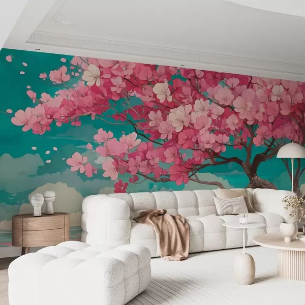 Carta da parati Un albero di fiori di ciliegio rosa con petali che cadono e un cielo blu in stile romantico nr. w09120