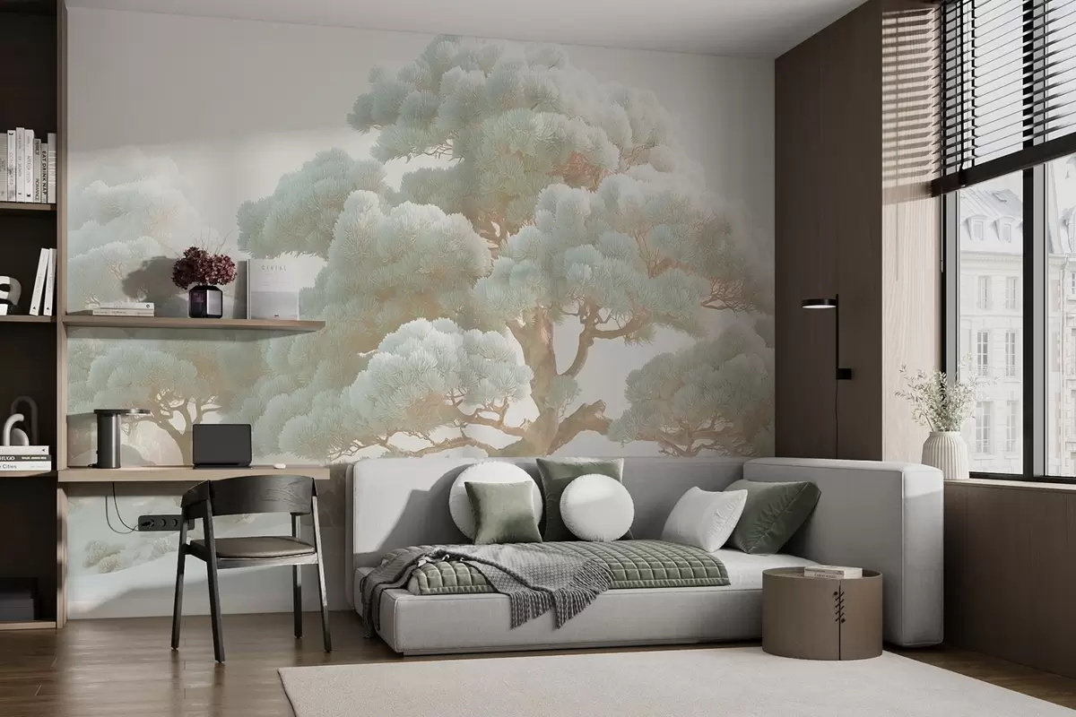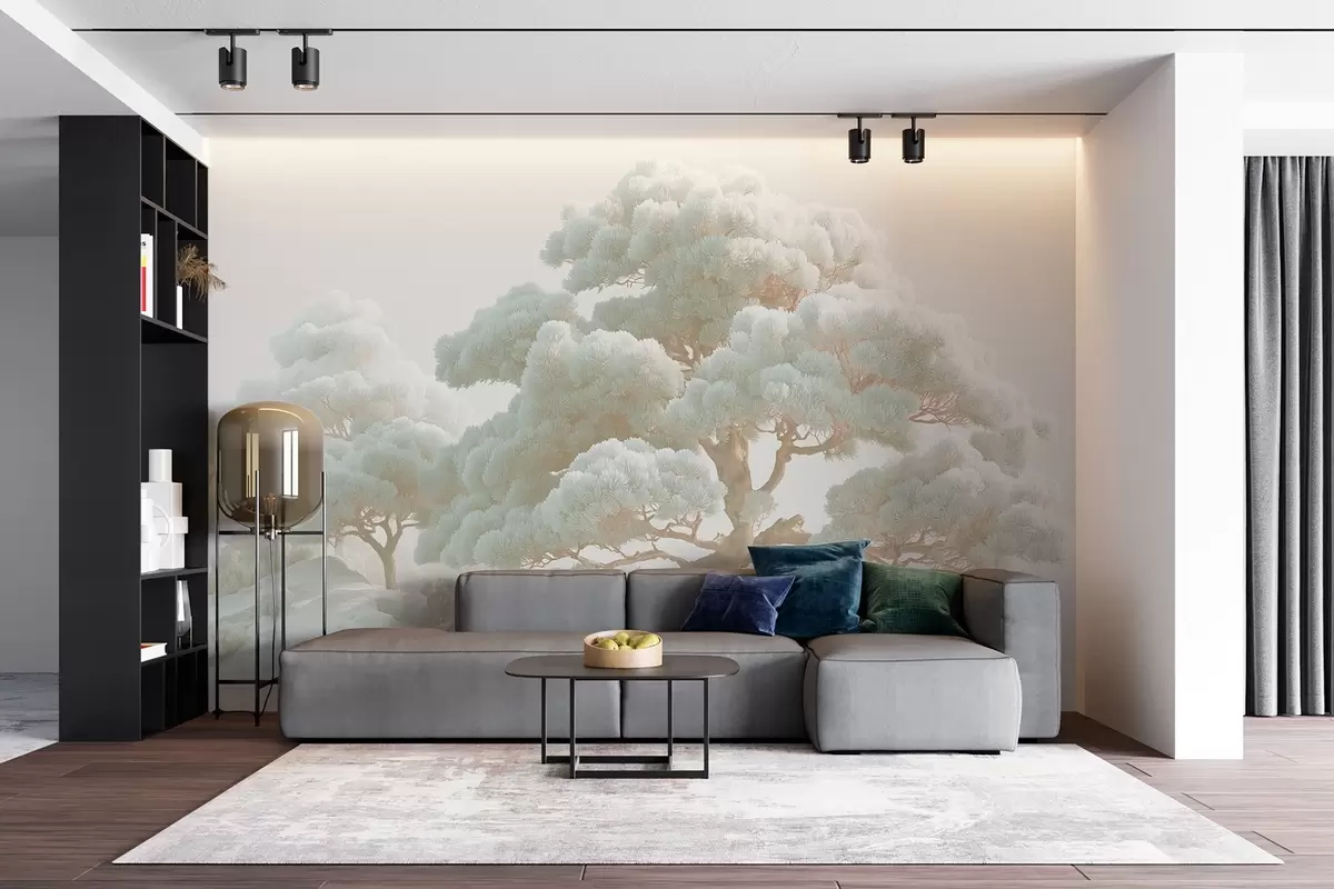 Carta da parati Pini nella nebbia in toni tenui in piedi in una foresta nr. w09122