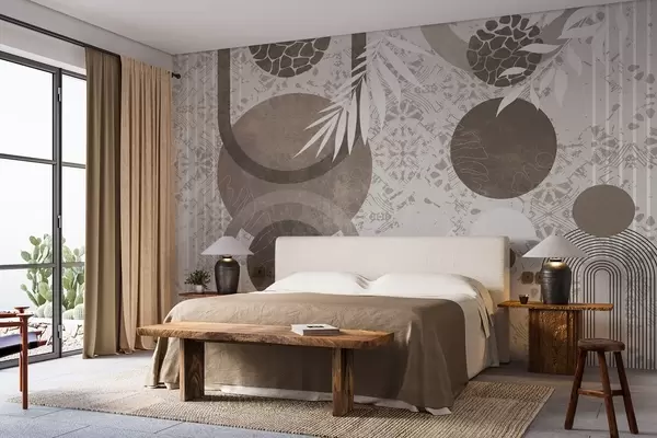 Carta da parati Forme geometriche astratte in marrone e bianco, cerchi, archi ed elementi botanici, design moderno e minimalista nr. w09130