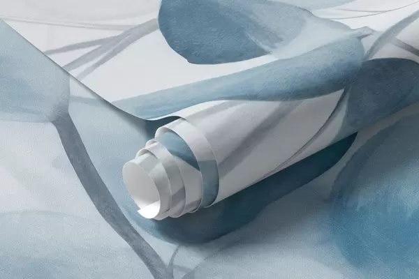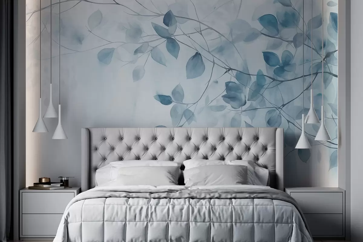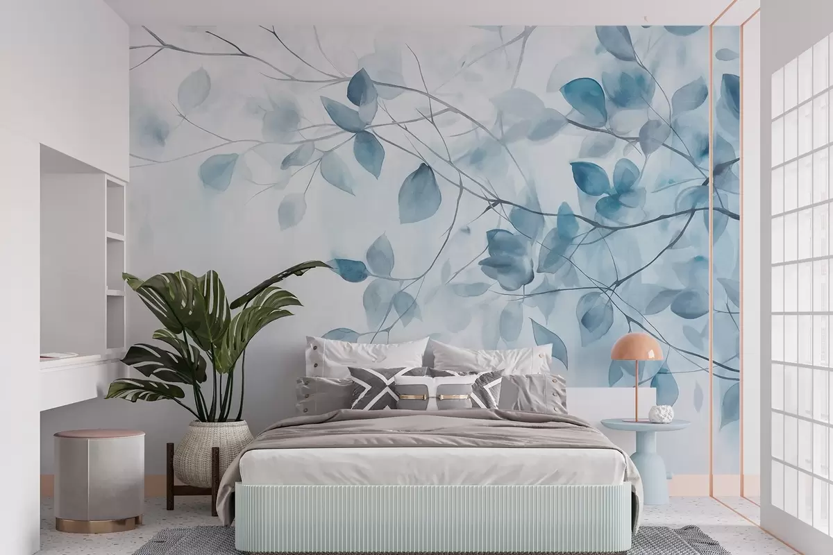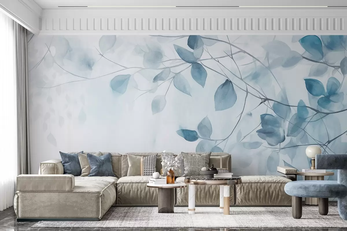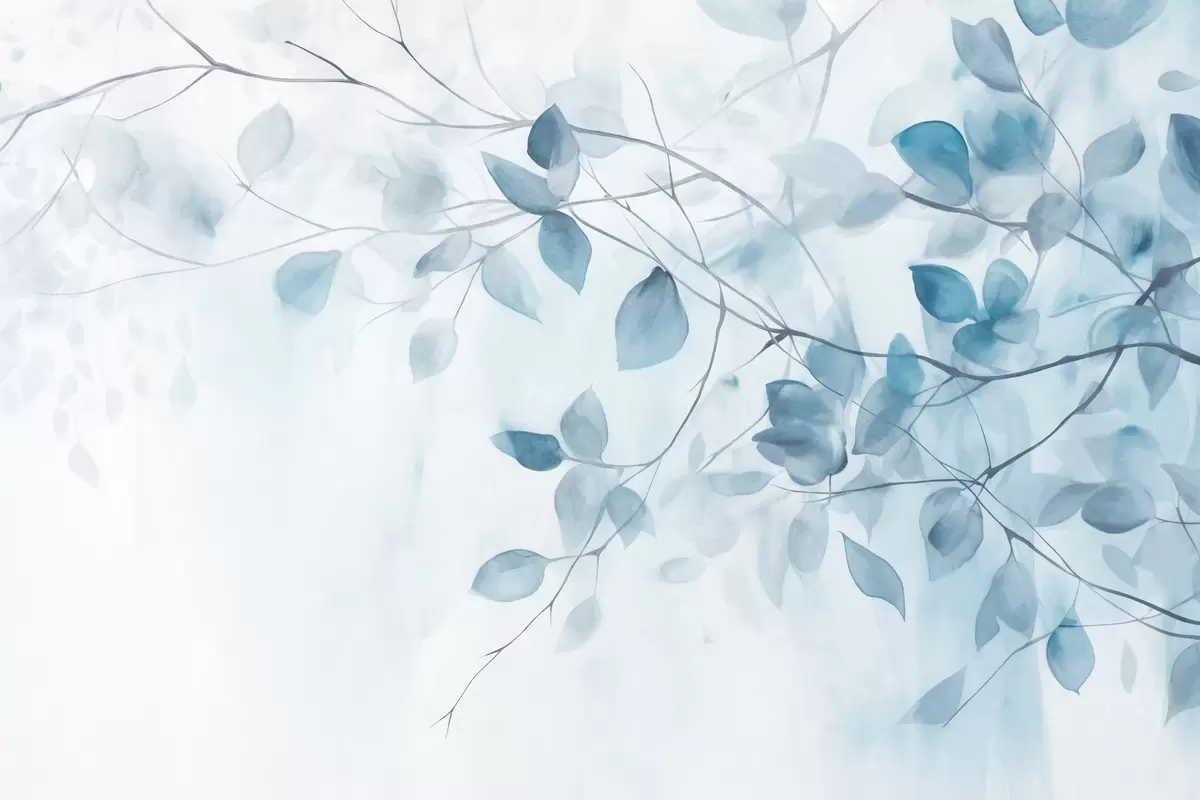 Carta da parati Pittura ad acquerello texturizzata con imitazione di foglie e rami blu, colori tenui, dettagli delicati su sfondo bianco nr. w09133v1