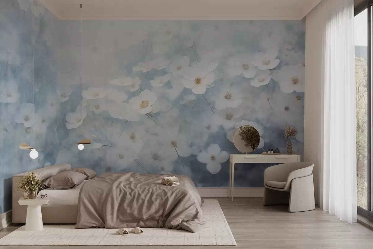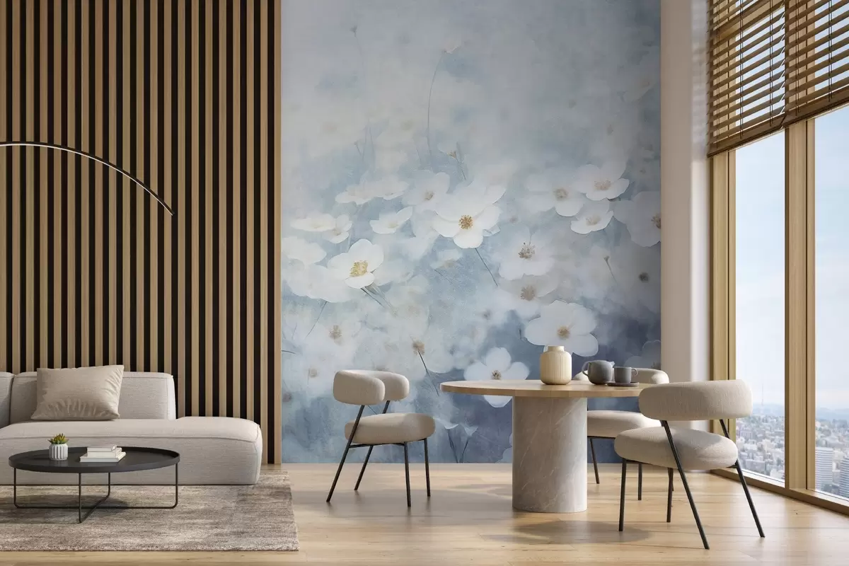 Carta da parati Campo testurizzato di fiori di anemone bianchi, messa a fuoco morbida, atmosfera sognante, tavolozza di colori bianchi e blu chiaro, prato primaverile nr. w09134