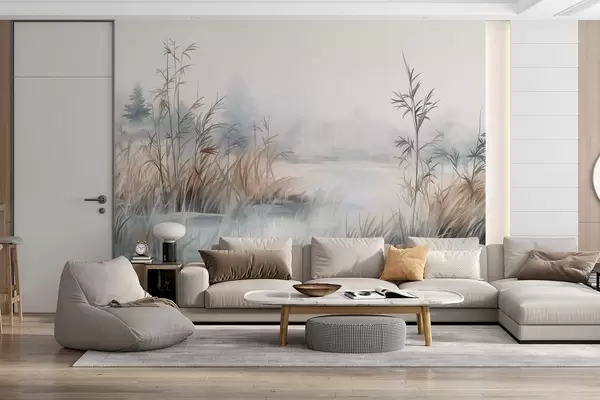 Carta da parati Paesaggio strutturato di un lago con erbe alte in primo piano, blu e marrone tenui, acqua calma, alberi in lontananza nr. w09137
