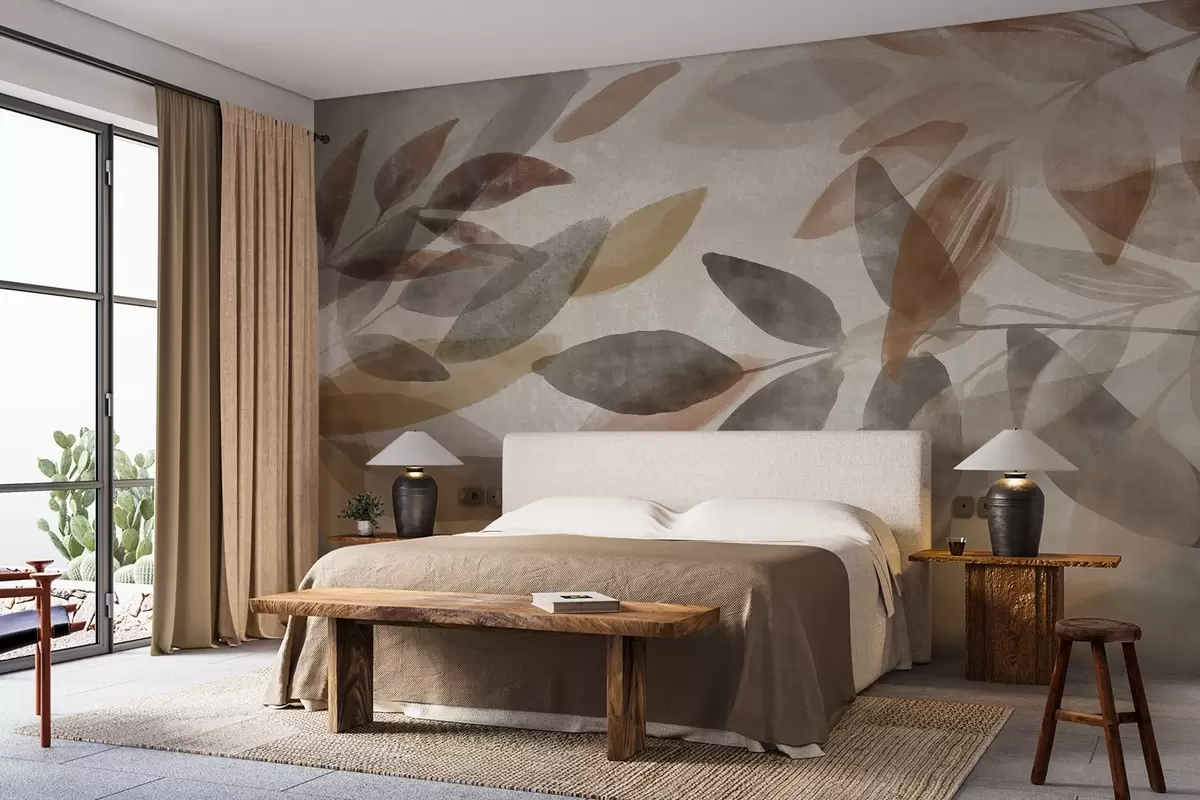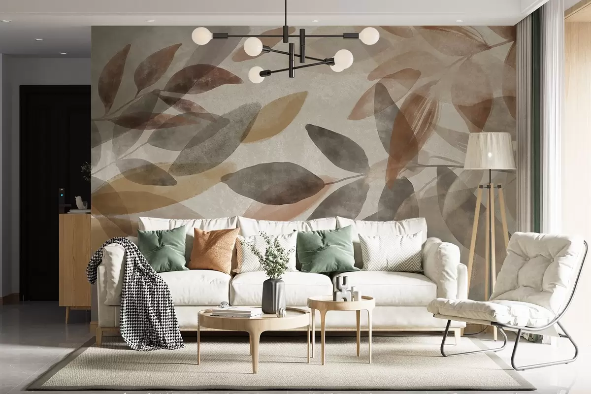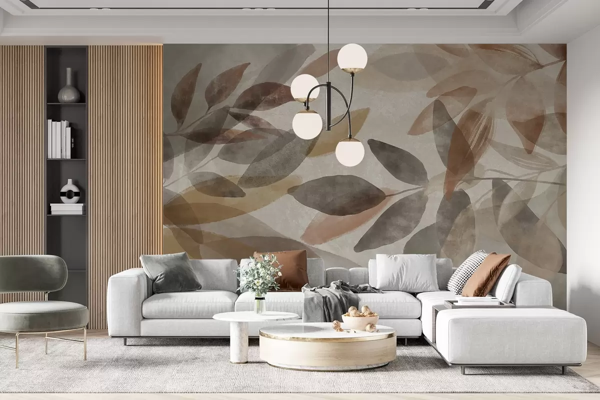 Carta da parati Foglie astratte dai toni tenui del marrone, del beige e del grigio, forme trasparenti, stile minimalista, forme organiche nr. w09140