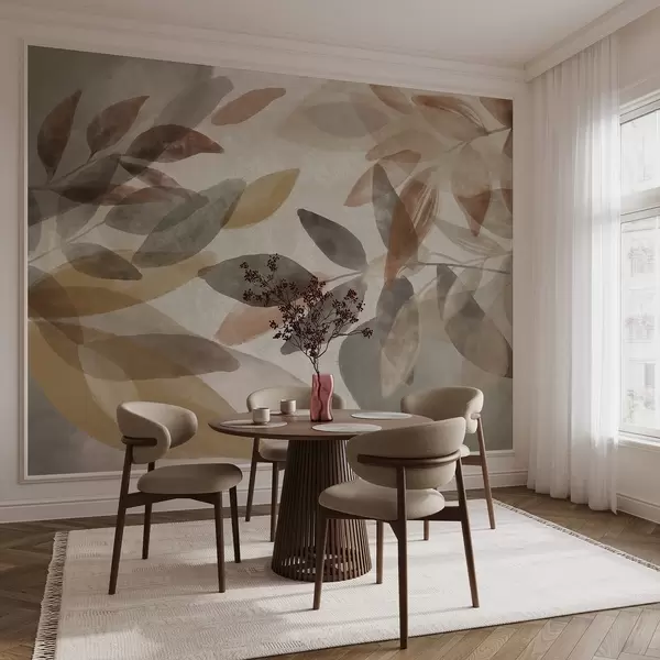 Carta da parati Foglie astratte dai toni tenui del marrone, del beige e del grigio, forme trasparenti, stile minimalista, forme organiche nr. w09140