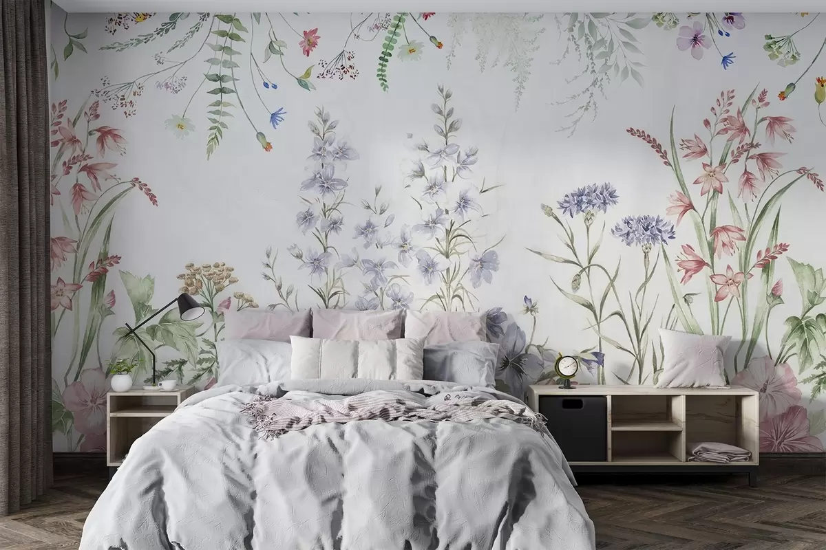 Carta da parati Composizione floreale con fiori colorati e foglie verdi, illustrazione botanica, colori pastello tenui, stile vintage nr. w09143