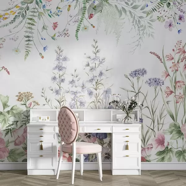Carta da parati Composizione floreale con fiori colorati e foglie verdi, illustrazione botanica, colori pastello tenui, stile vintage nr. w09143