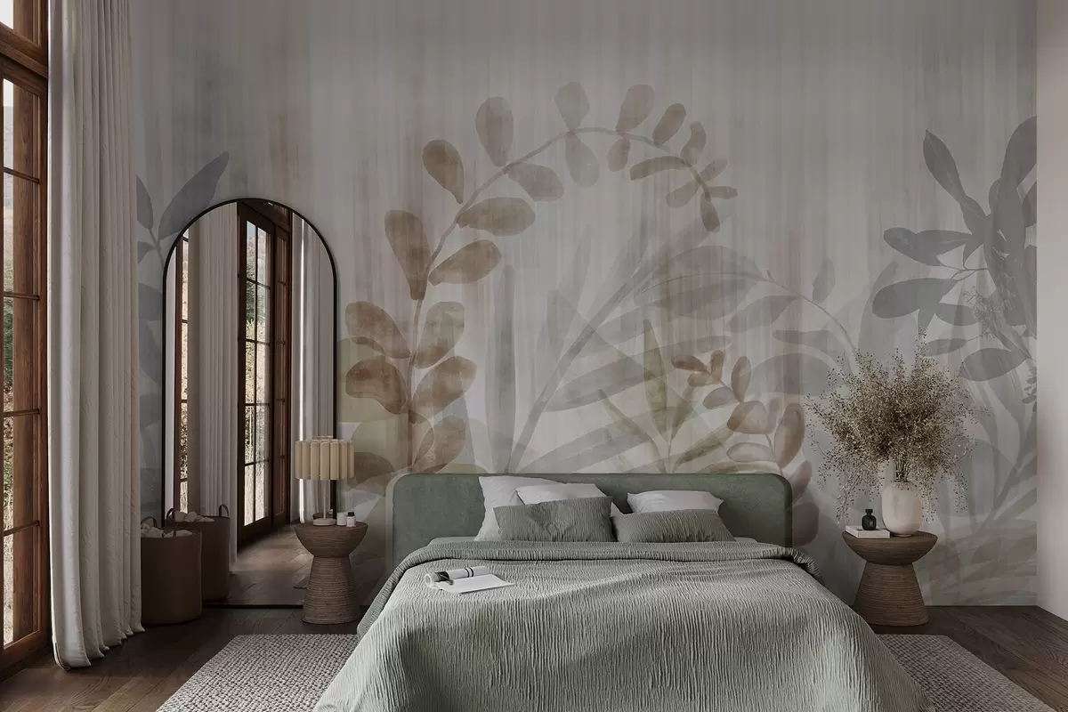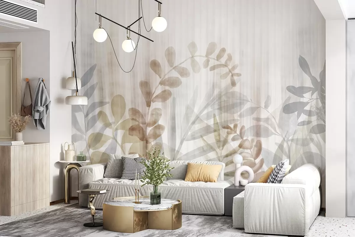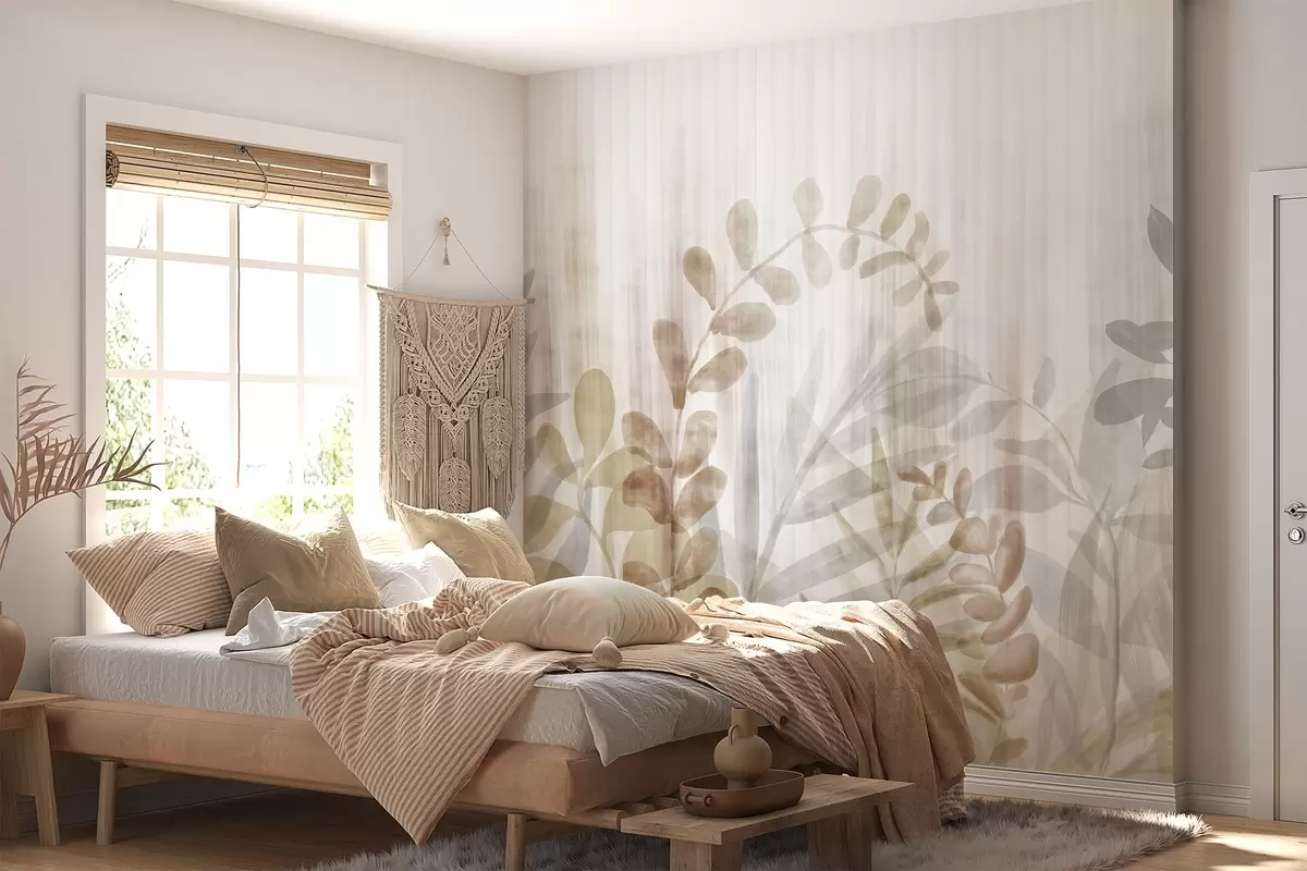Carta da parati Pittura ad acquerello imitazione di piante con foglie multicolore tenui, sfondo chiaro con linee verticali, illustrazione botanica nr. w09146