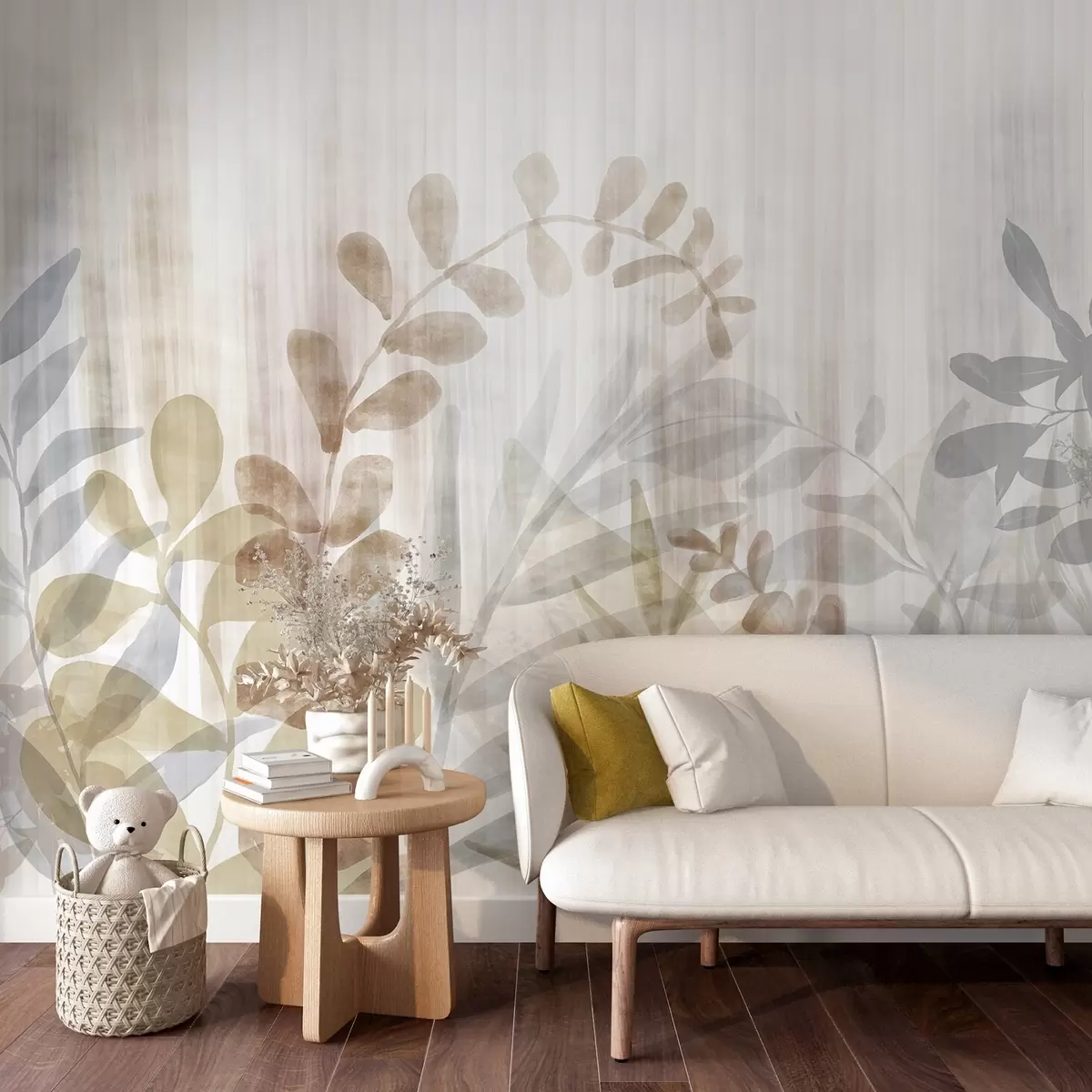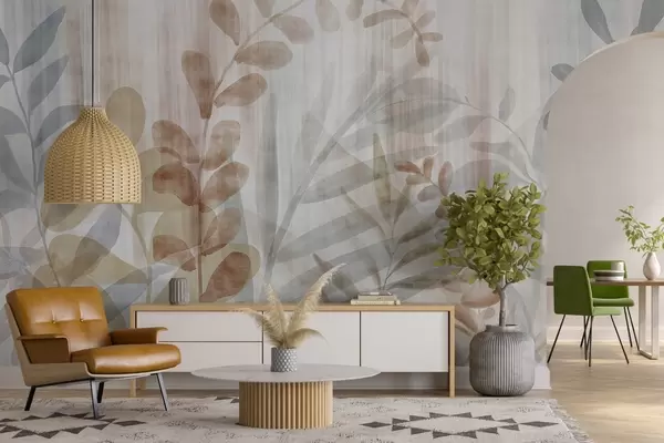 Carta da parati Pittura ad acquerello imitazione di piante con foglie multicolore tenui, sfondo chiaro con linee verticali, illustrazione botanica nr. w09146