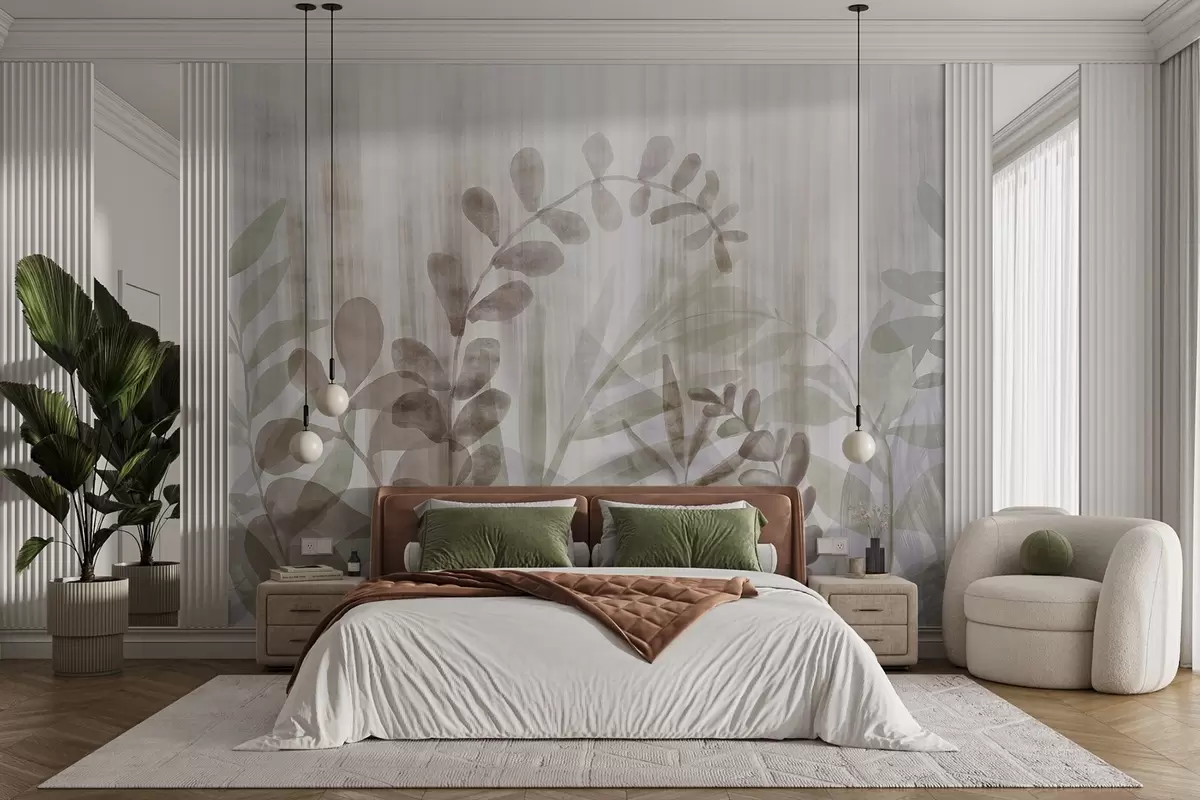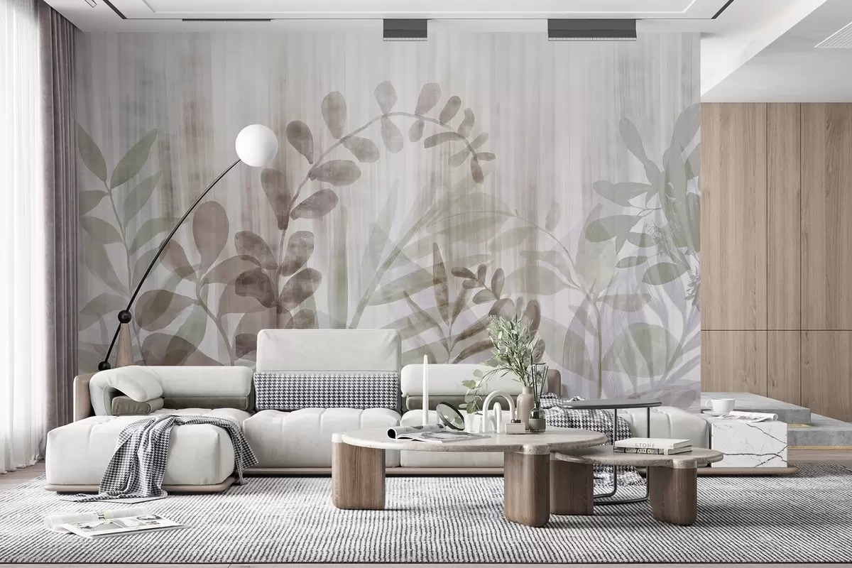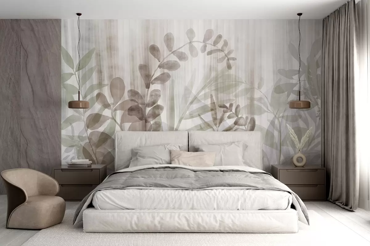 Carta da parati Pittura ad acquerello imitazione di piante con foglie multicolore tenui, sfondo chiaro con linee verticali, illustrazione botanica nr. w09146v1