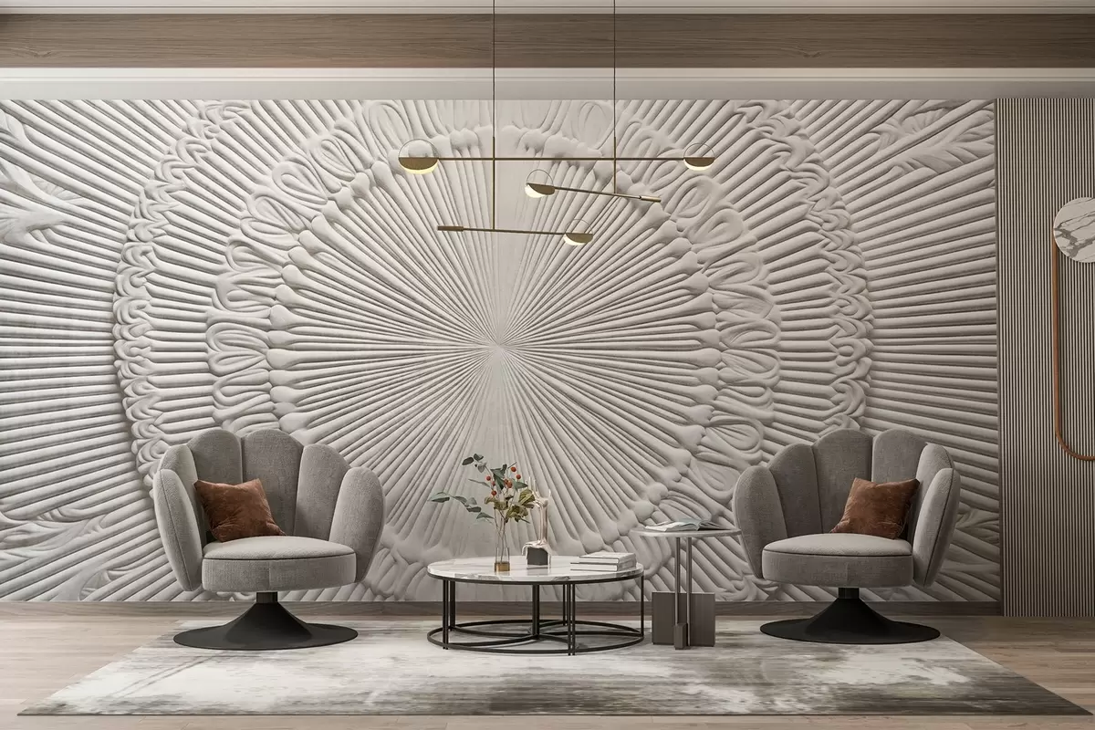 Carta da parati Stampa circolare astratta con linee radiali ed elementi decorativi, disegno simmetrico, texture a rilievo nr. w09154