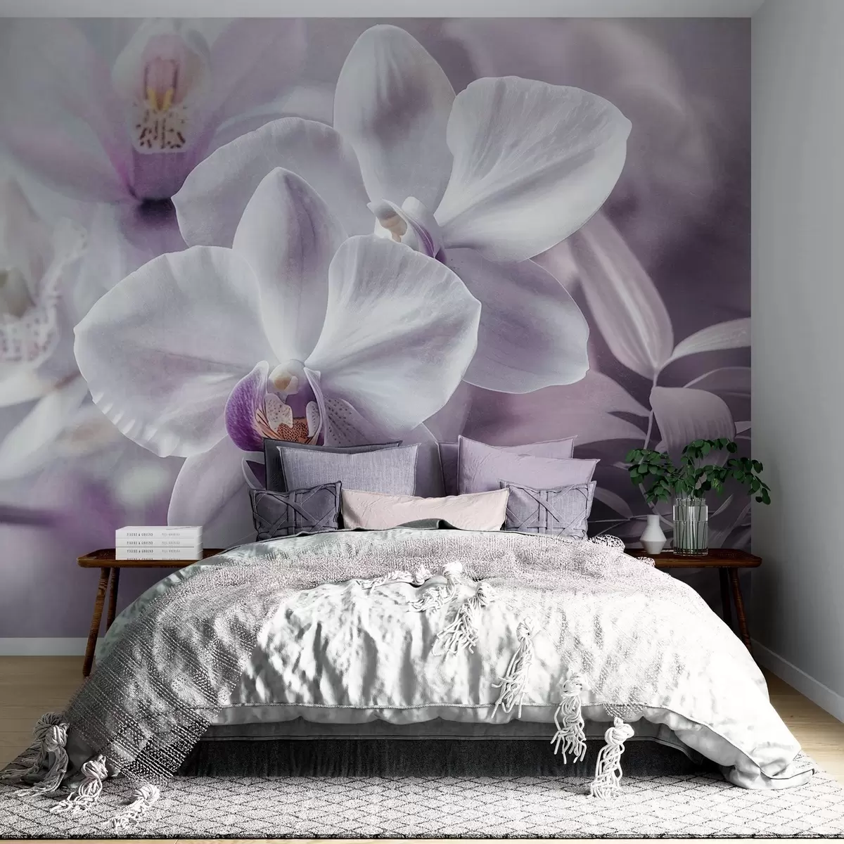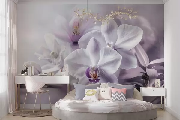 Carta da parati Fiori di orchidea delicati bianchi e lilla, luci soffuse e sfondo sfumato nr. w09155