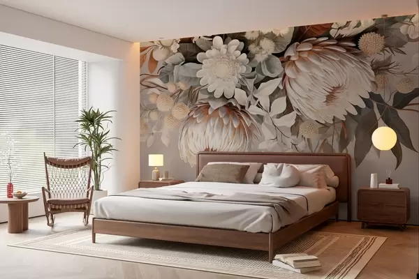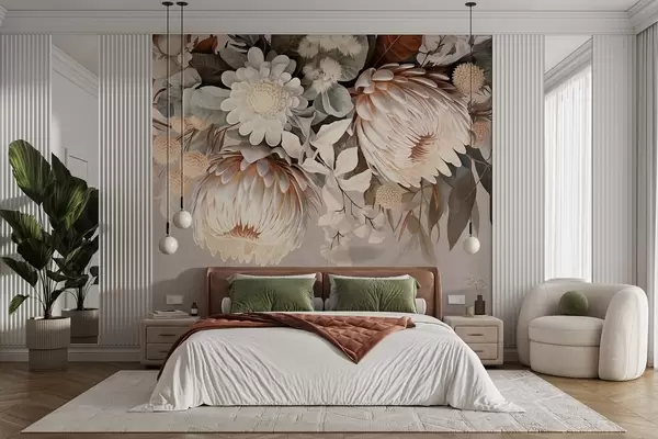Carta da parati Grande protea strutturata con accenti marroni, margherite bianche e fiori gialli, sfondo beige attenuato nr. w09157