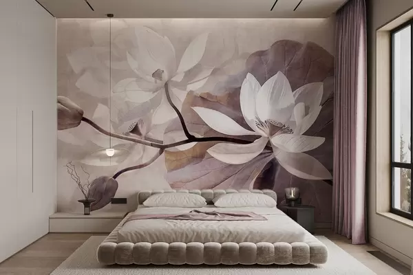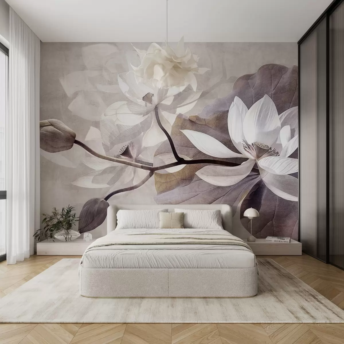 Carta da parati Fiori di loto delicati a grana grossa con foglie e steli in una tavolozza di colori beige e tenui nr. w09159