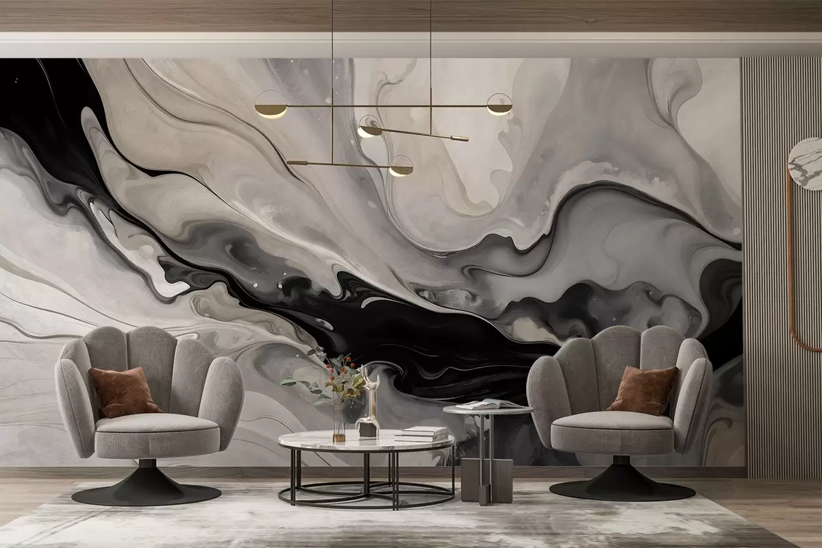 Carta da parati Pittura astratta a texture fluida nei toni del nero, del bianco, del grigio e del beige imitazione marmo nr. w09160