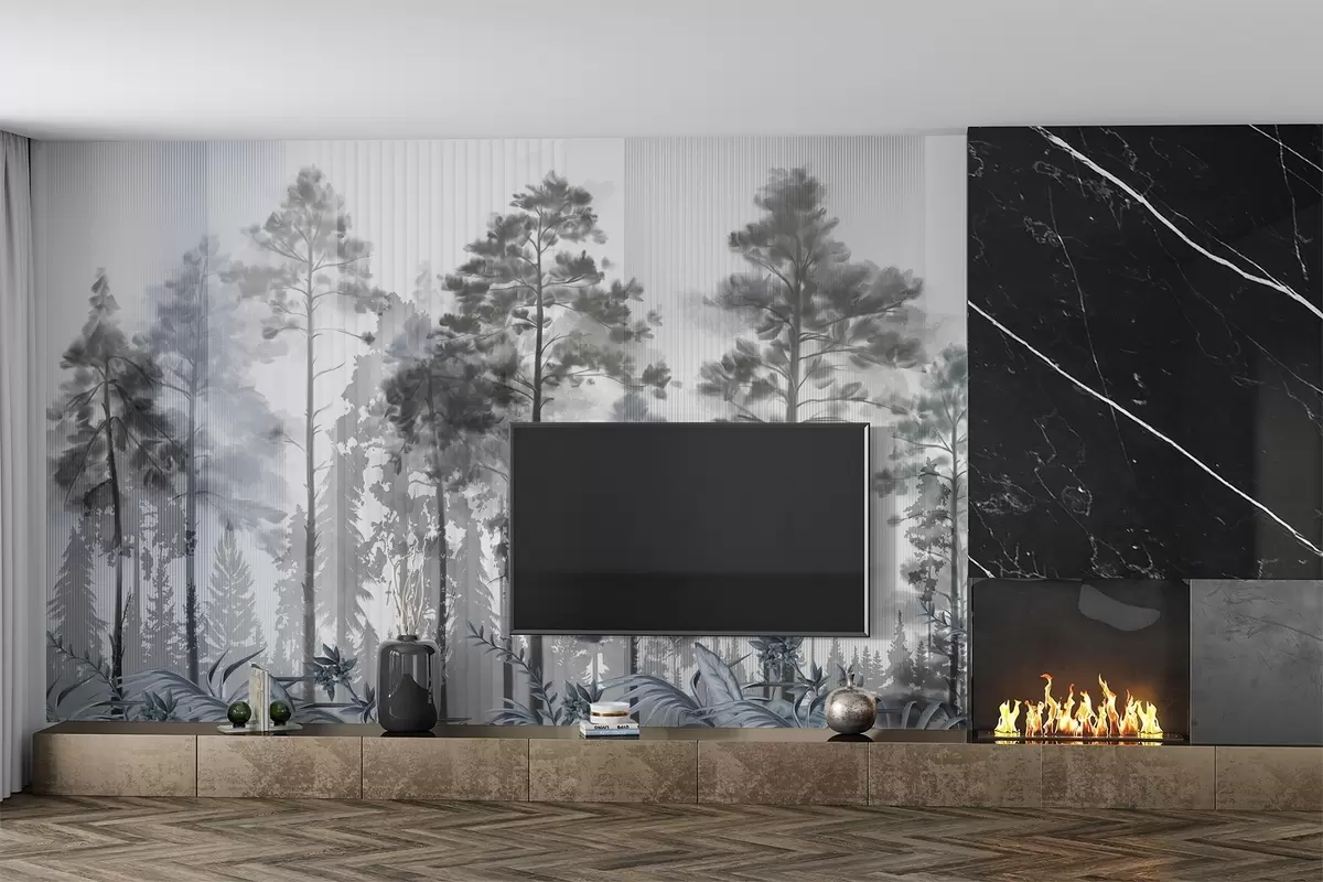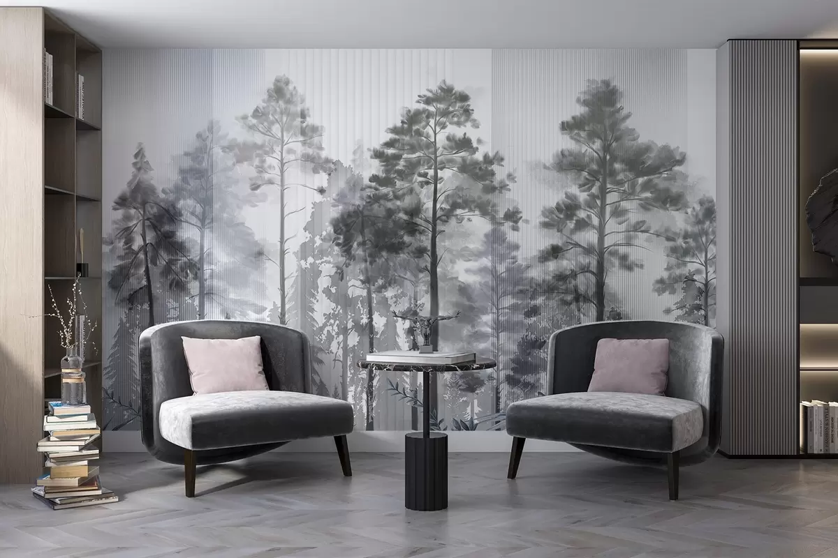 Carta da parati Una fitta foresta con alti pini, fogliame grigio e lussureggiante, un'atmosfera nebbiosa con texture a linee verticali nr. w09163v2