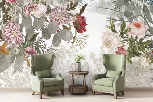 Carta da parati Composizione floreale vintage con rose, eucalipto e mimosa nei toni del verde tenue, del rosso e del rosa nr. w09164v1