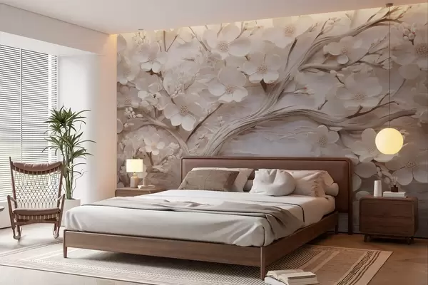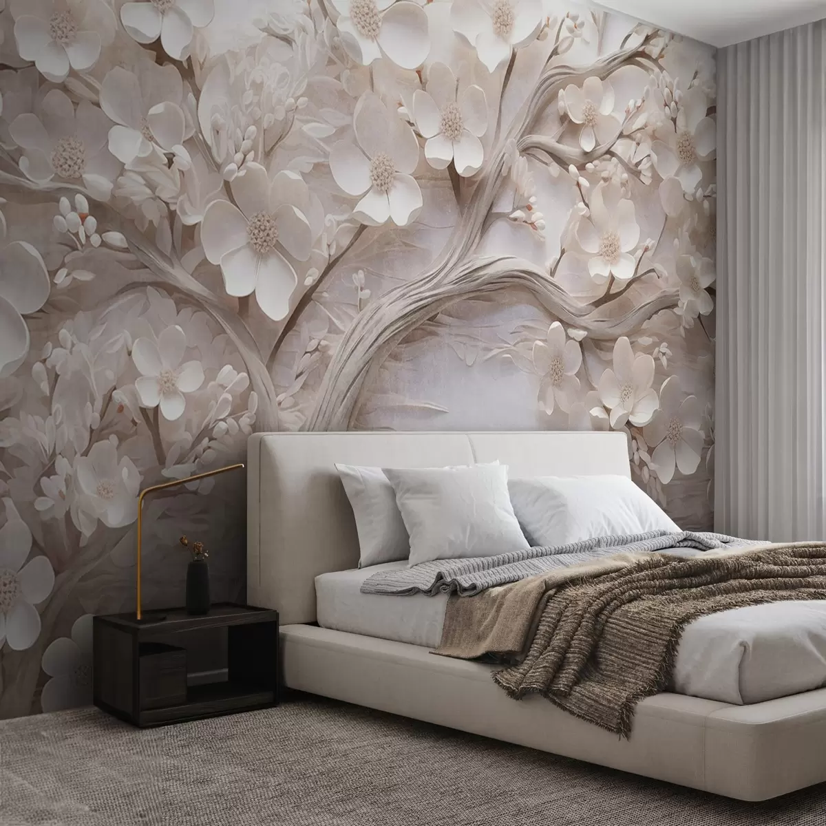 Carta da parati Albero strutturato con fiori bianchi e un tronco marrone, lo sfondo è bianco con linee orizzontali illuminazione morbida nr. w09166
