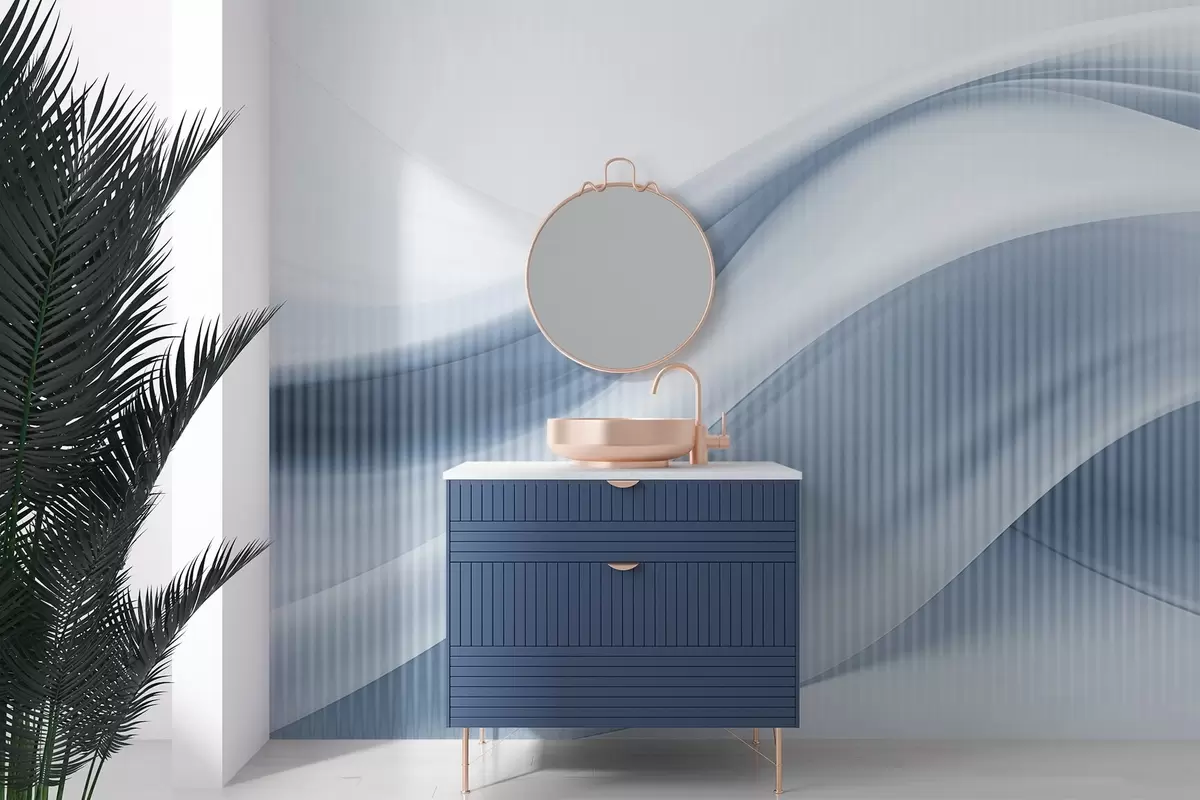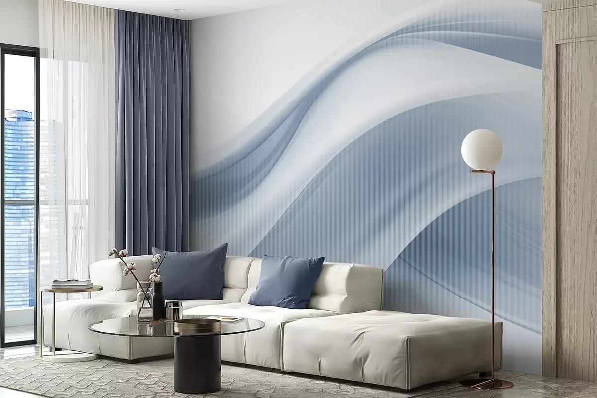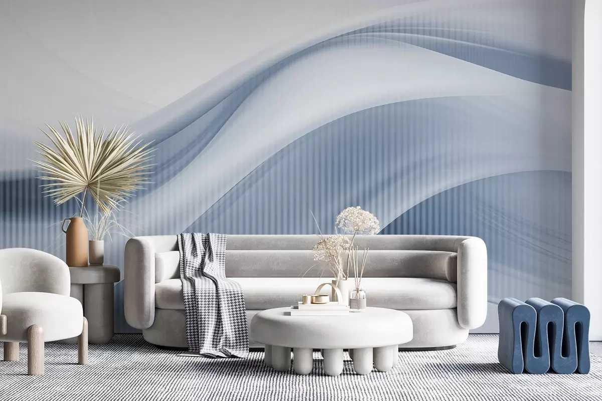 Carta da parati Stampa astratta con linee fluide e sottili strisce verticali, che creano un senso di movimento e profondità, palette blu nr. w09189v1