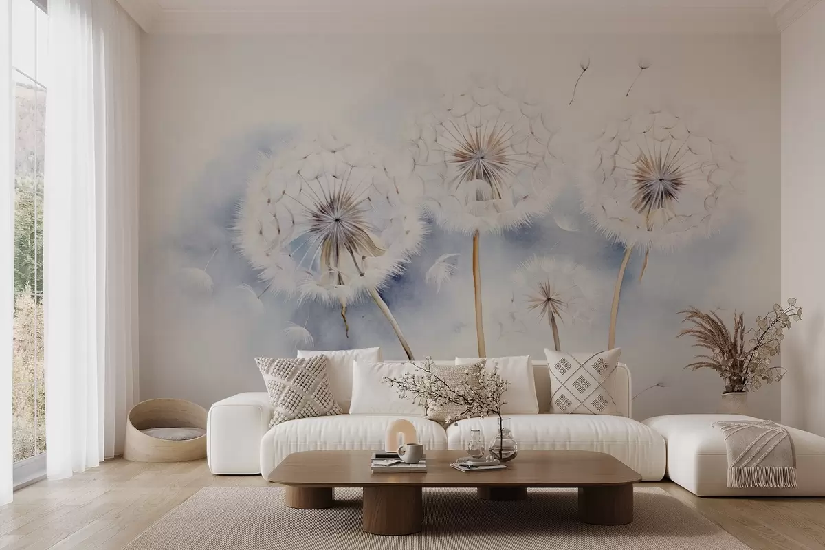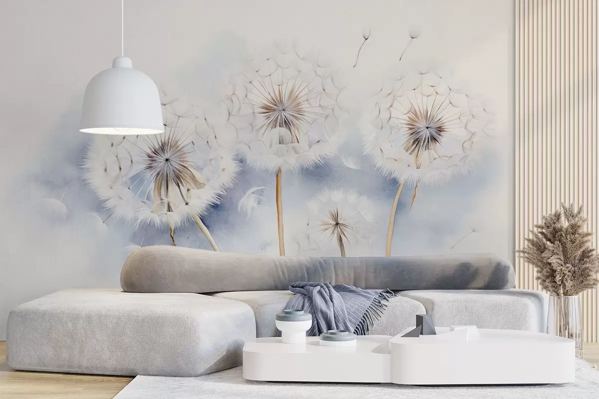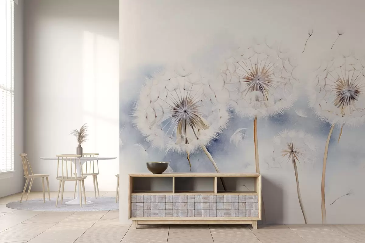 Carta da parati Dente di leone strutturato con semi che fluttuano nell'aria, sfondo azzurro e bianco, stile di disegno morbido e delicato nr. w09190