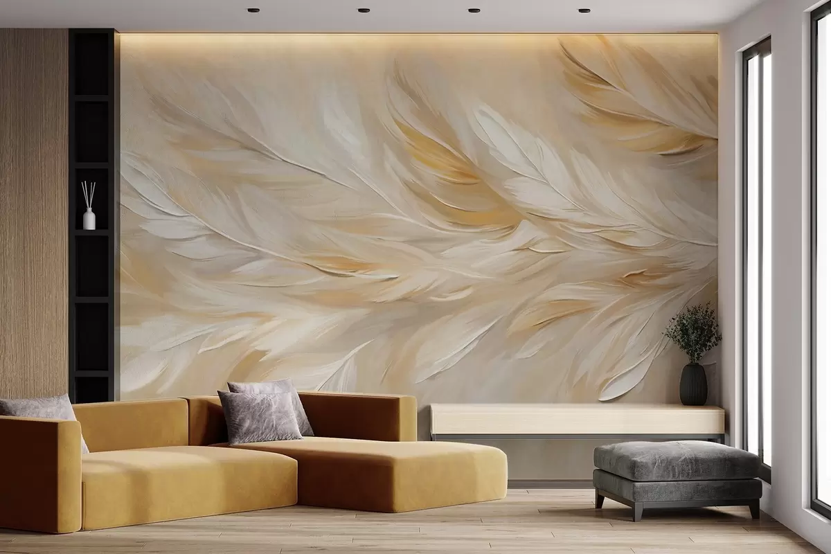 Carta da parati Piume bianche e beige disposte in una stampa fluida, texture morbida, tavolozza di colori caldi, sfondo astratto nr. w09191